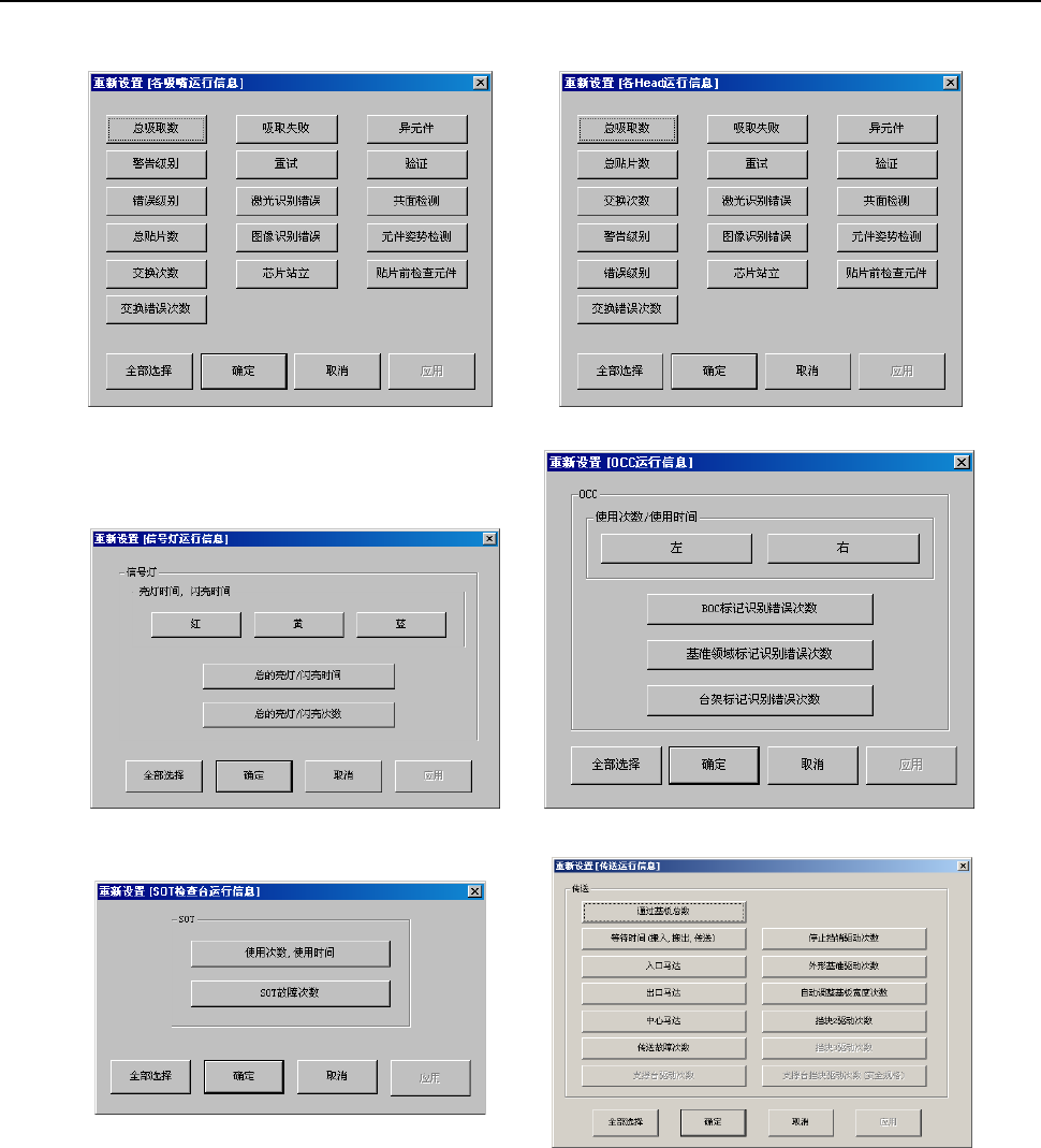 第 2 部 功能详解篇 第 9 章 设备运行信息 9-5- 17 -2 在重新设置项目选择画面上重新设置设备运行信息 在反映各项运行信息的菜单上点击 “数据 ( D ) ” 、 “重新设置” , 或点击工具栏的 “重新设置” , 即可显示“重新设置”画面。 图 9-5- 17 -2-1 重新设置各吸嘴运行信息画面 图 9-5- 17 -2-2 重新设置各 Head 运行信息画面 图 9-5- 17 -2-3 重新设置信号灯运行信息画面 …