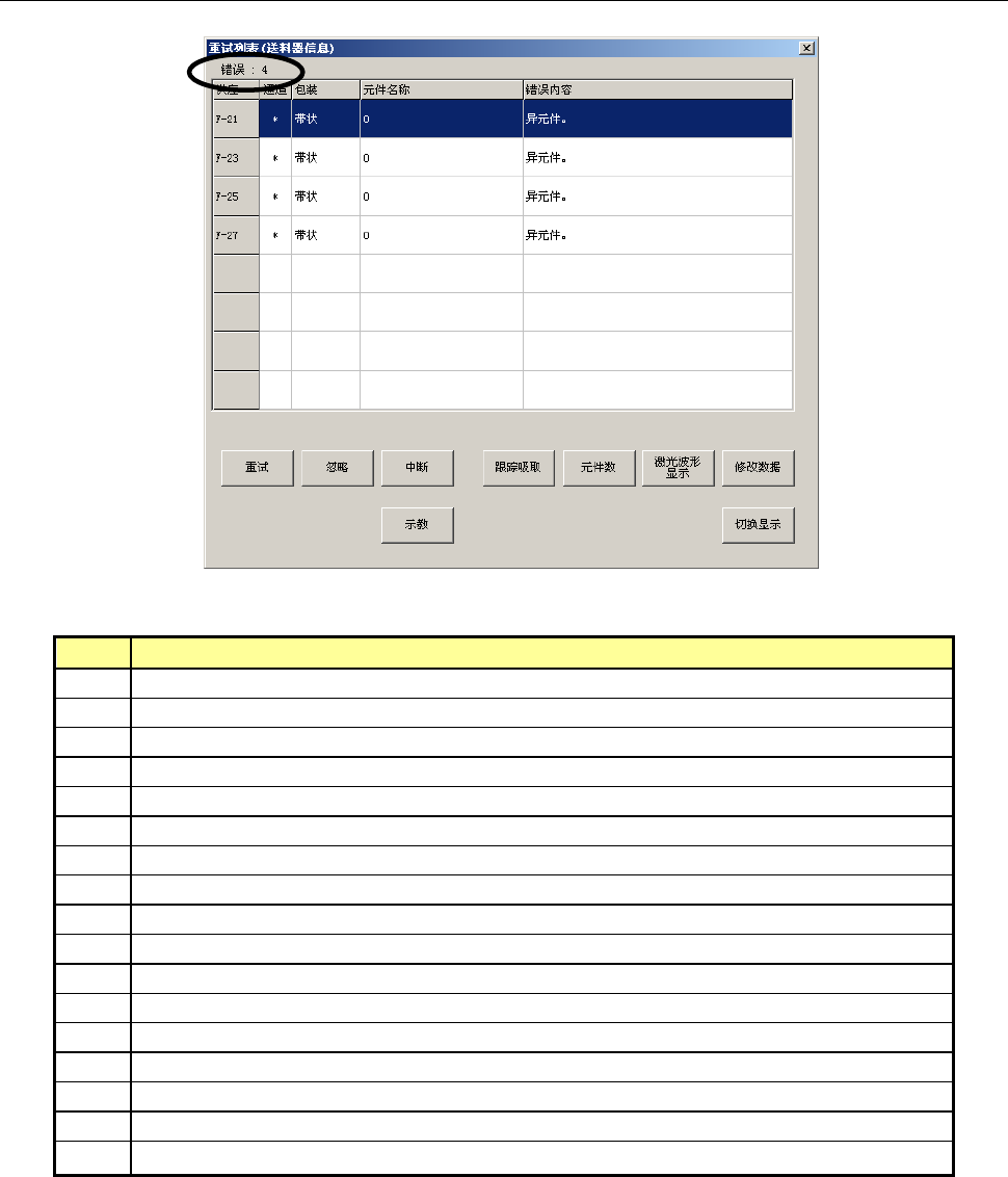 第 2 部 功能详解篇 第 12 章 程序 补充 12 -9 生产时出错的详细内容 生产时出错的详细内容。 ( 请参照 2- 10 -5 章 ) ① LA 识别 值 错误显示内容 64 无元件 67 LNC 收到强制结束测量的命令。 70 检测出固件部不应发生的状态 74 取得了错误宽度数据。 80 检测出左端的窗口阻塞错误 81 检测出右端的窗口阻塞错误 82 检测出左右两边的窗口阻塞错误 93 设置的元件形状与实际的元件外形不适合。…