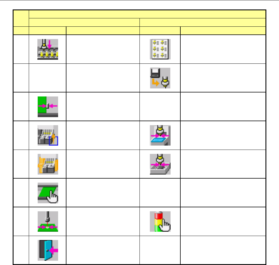 第 1 部 基本篇 第 1 章 设备概要 换页 ( Ⅲ ) 1/2 2/2 No. 图标 名称 图标 名称 1 生产状态 重试一览 未贴片一览 2 生产管理信息 ( 综合 ) 重试一览 供给设备信息 3 元件数量设定 4 操作选项 5 数据变更 6 激光高度检测 7 生产信息管理 吸取率 8 退出 返回桌面。 退出 返回桌面。 1- 61