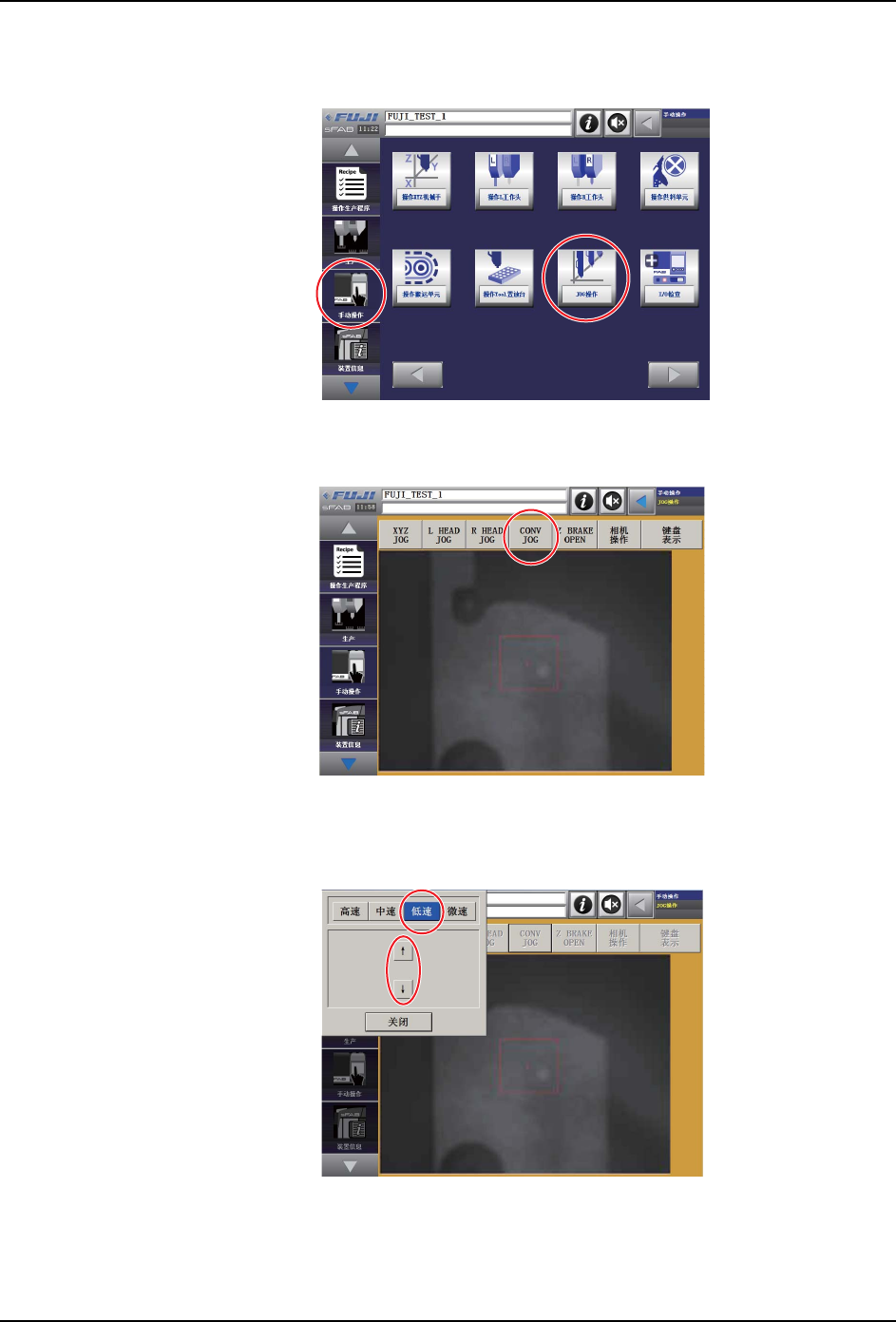 8. 在下图的操作画面中按照 「手动操作」→ 「JOG 操作」的顺序点击图标。显示 JOG 操作