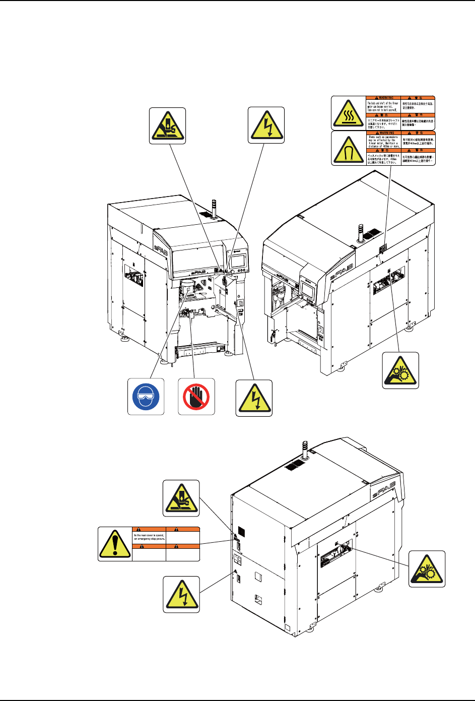 表示使用机器时的注意事项的安全标识贴在机器的下图所示位置。