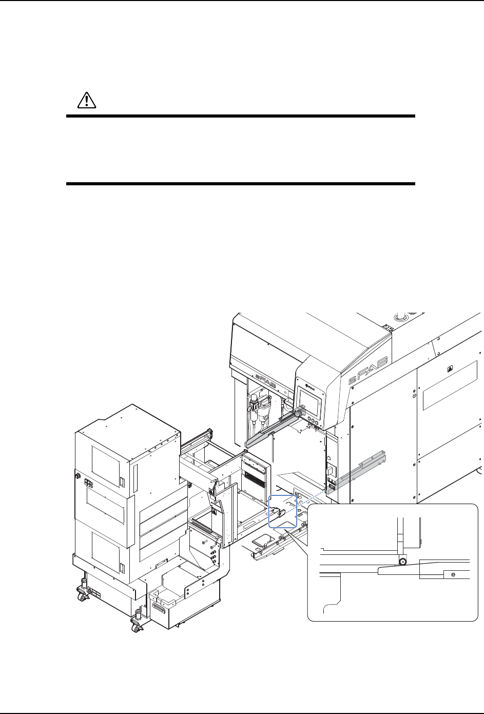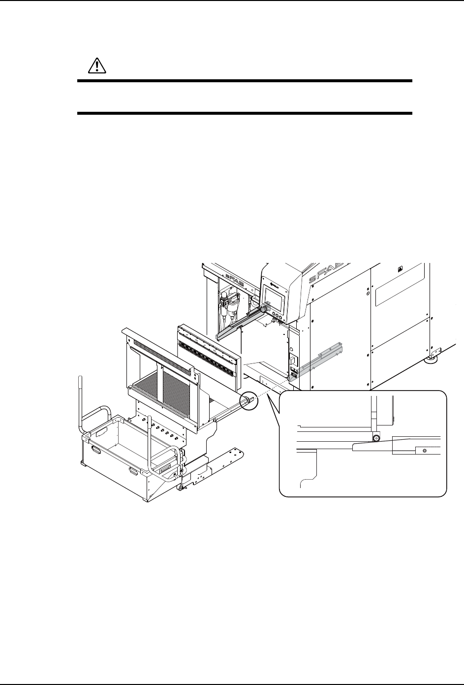 4. 基本操作 MEC-SFAB-005S0 50 SmartFAB 机械手册 4.1.2 拆除方法 注意 )在拉出 sMTU-LT2 之前,请不要忘记在操作画面上解除 sMTU-LT2 的锁定。在 sMTU-LT2 被夹紧的状态下,拉出单元有可能损坏。 1. 请按照操作画面上的 「手动操作」→ 「操作供料单元」顺序点击图标。 2. 选择 「供料单元松开」 。sMTU-LT2 处于可拆除的状态。 3. 打开脚轮,从机器中缓慢拉出 sMT…