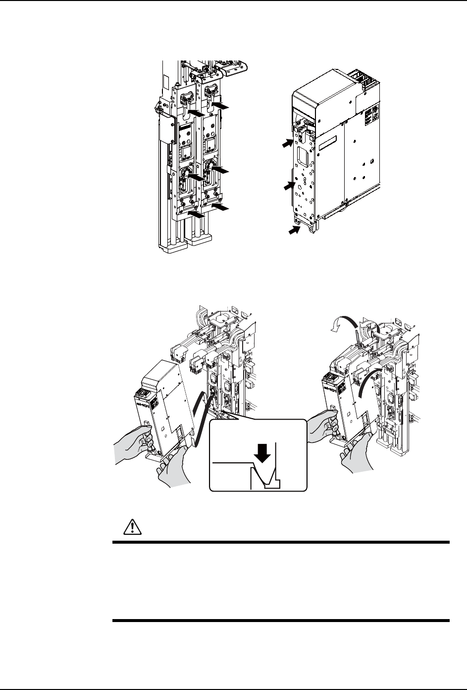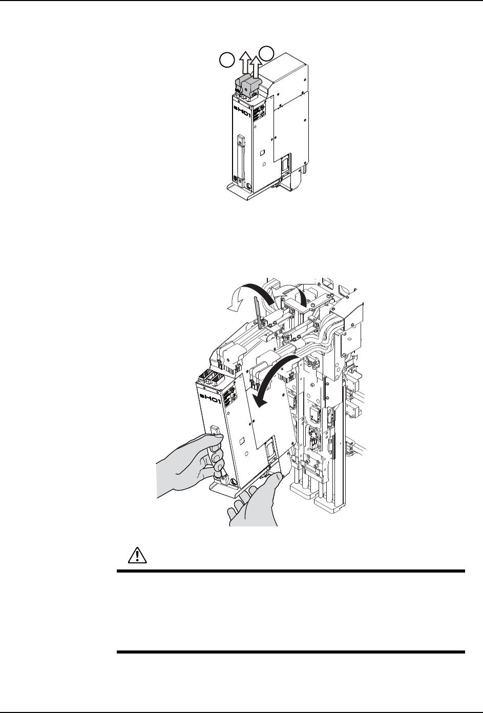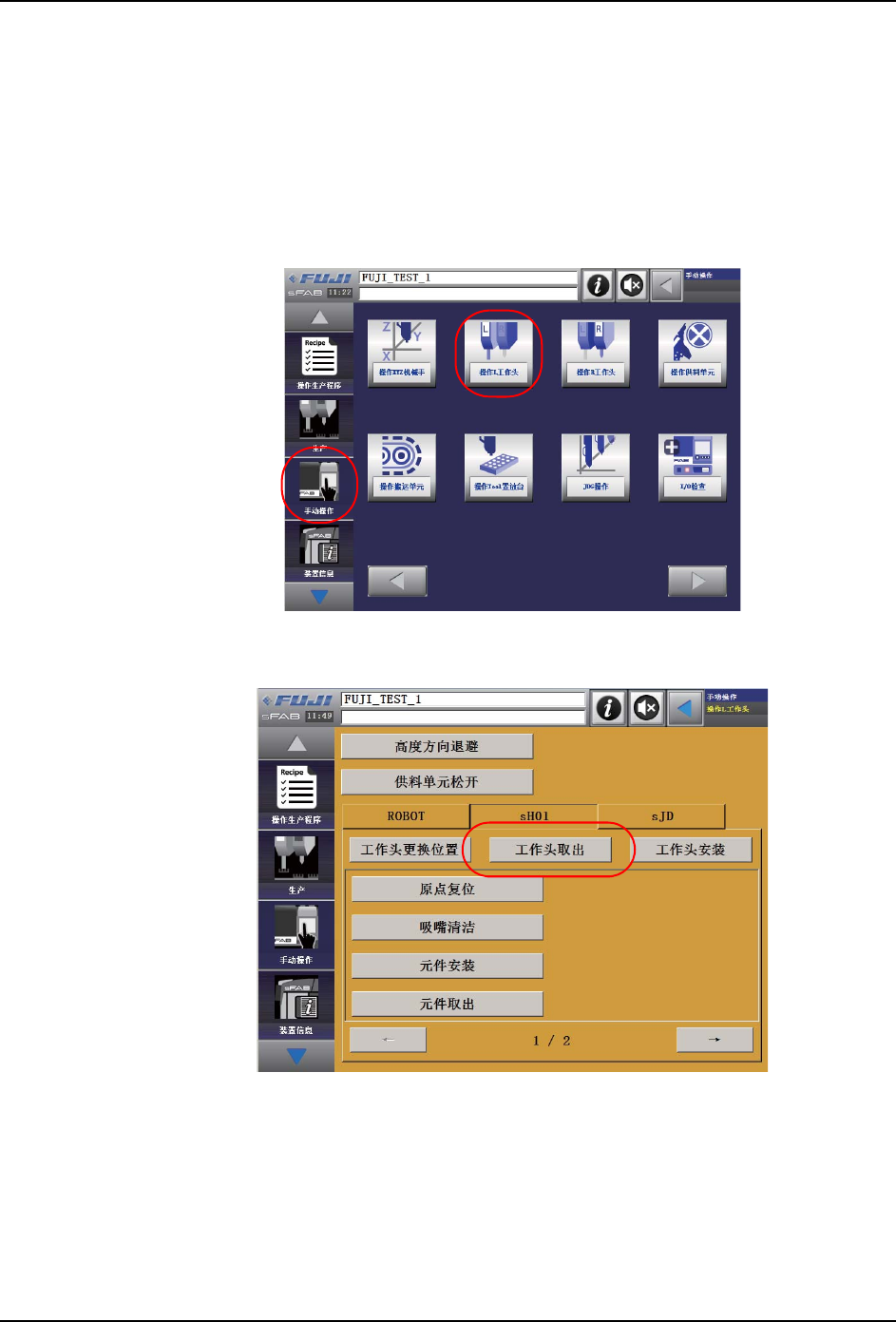 MEC-SFAB-005S0 4. 基本操作 SmartFAB 机械手册 55 4. 从工作头上拔出导线接插件。 5. 一手握住工作头的手柄。一手拉起 机器上的操作杆向左侧推到,将工 作头拉到自己前 面。用没有握住把手的手从下面托 住工作头,从升降头上拆除工作头 。 备注 )由于工作头内有残留真空 , 工作头与升降头相互吸住而可能导致不容易拆除 。此时 , 稍微向上滑动工作头,放出真空。 备注 )将拆除的工作头平放在作业台上,避免压弯 …