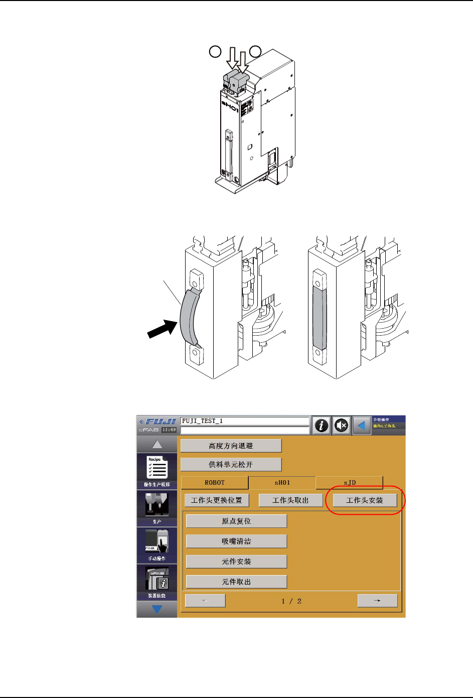 4. 基本操作 MEC-SFAB-005S0 56 SmartFAB 机械手册 安装工作头 1. 确认工作头与升降头的安装部位是 否清洁。如果沾有异物等,用布擦 去。 2. 握住工作头的手柄,将工作头的夹 紧部位卦在升降头上,在保持向左 侧推到控制杆的状 态下,将工作头推入升降头中。放 开控制杆。 注意 在机器内部安装工作头时,请不要 将工作头靠近线性马达。线性马达 产生 的磁场有可能损坏工作头。另外, 务在必指定更换位置上拆除 / 安…