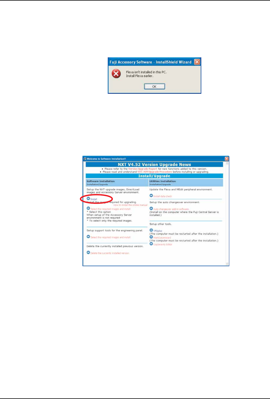 SET-NXT3-006S1 5. 安装 Fuji 附加软件 NXT III 安装手册 99 5.4 Fuji 附件软件服务器的安装 注意事项 : 对要安装 Fu ji 附件软件 的 PC, 请确认已经 安装了 Fuj i Flexa。 如果在没有安 装 Fuji Flexa 的 PC 要安装 Fuji 附件软件的话,显示出以下画面。 5.4.1 安装方法 1. 将 N XT 软件 CD-ROM(Disk1) 插 入到 CD 驱动器中。…