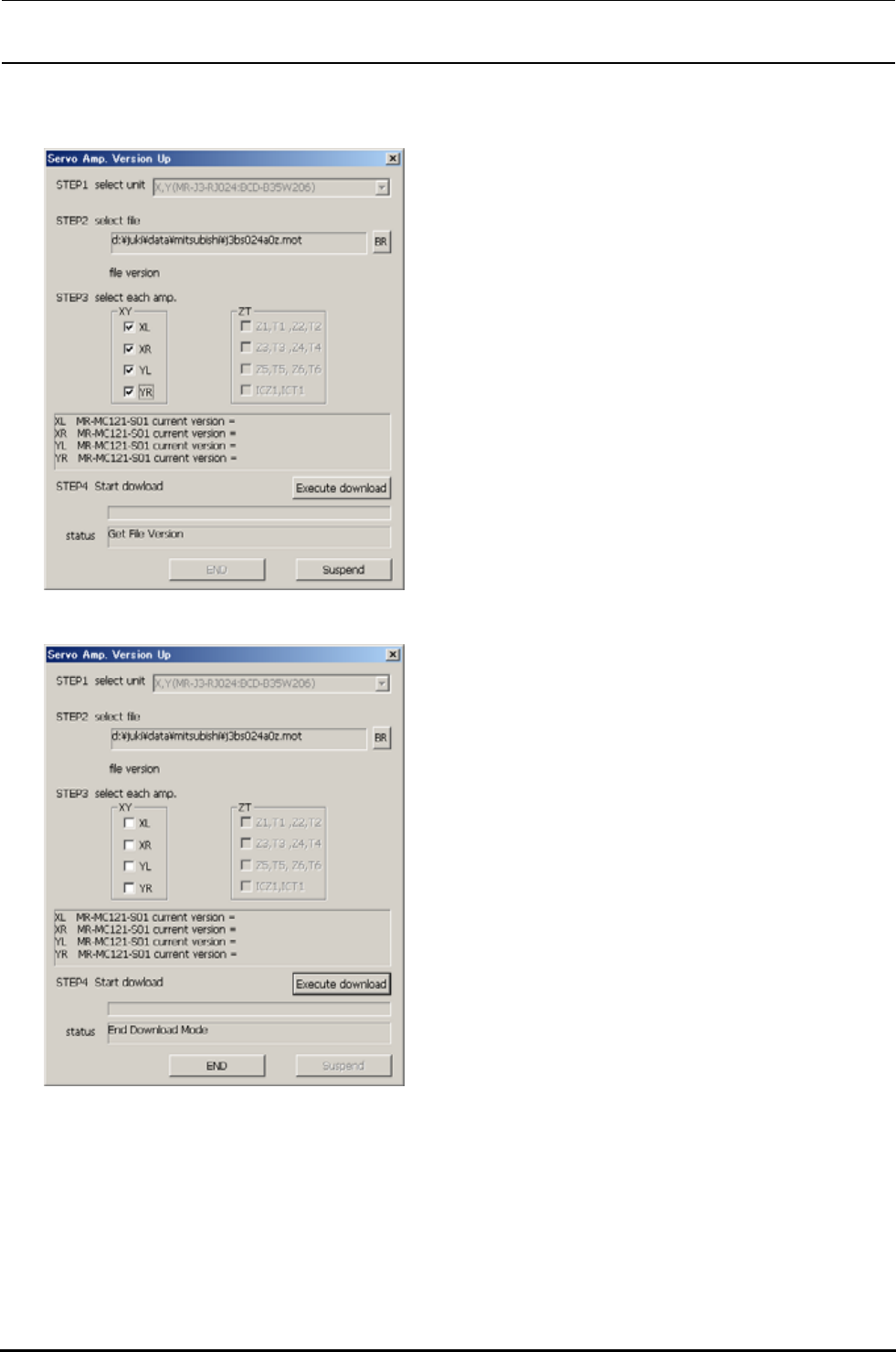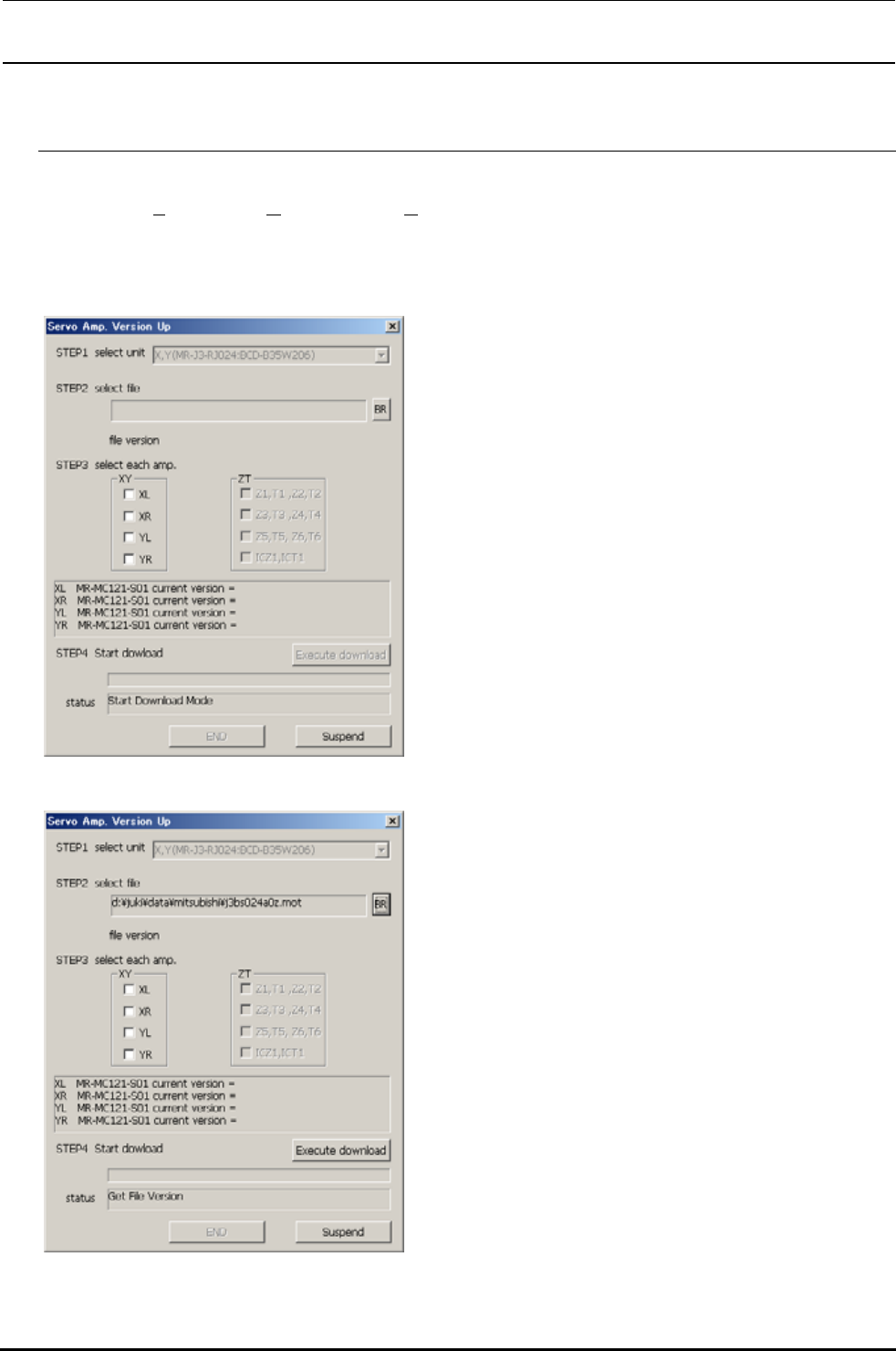Rev.1.00c MS 参数 5-5. Servo Amp 选择了 [ 其他 ( T )][ 版本升级 (U )] [Servo Amp.( S )...] 之后,显示下图所示的伺服放大器版本升级界面。 (1) 处理概述 STEP 1 进行伺服放大器的机种选择(可选择 XY 、 Zθ )。 STEP 2 点击「 BR (参照)」键,选择文件,读入版本升级所需的 Mot 文件。 5-5