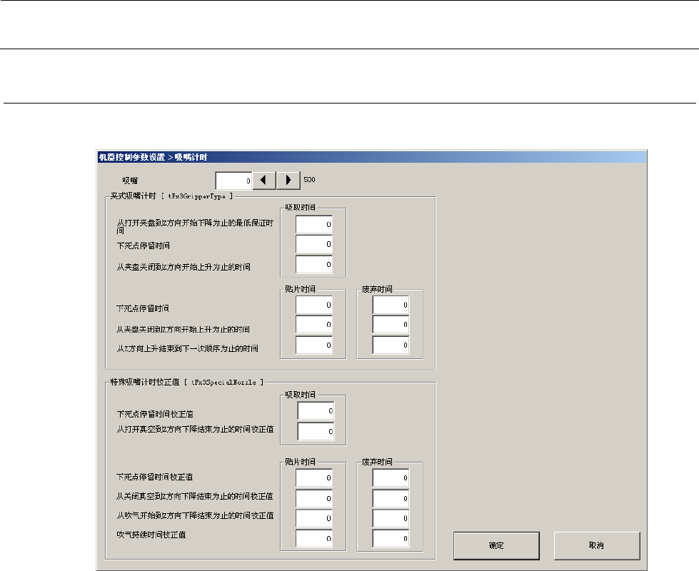 Rev 4 .0 机器控制参数 2-5-4-1 设定项目 No. 项目 输入范围 单位 备考 最小值 最大值 1 同时交换吸嘴 范围 X 0.1 µ m 初期值 : 1000 (0.1mm) 2 Y 0.1 µ m 初期值 : 1000 (0.1mm) 3 自动判别吸嘴种类时 , 从吸 嘴前沿开始的高度 0.1 µ m 初期值 : - 3000 ( 距前端 0.3mm ) 4 交换吸嘴时检 测吸嘴高度 (吸嘴先端基 准) 有吸嘴 0.1…