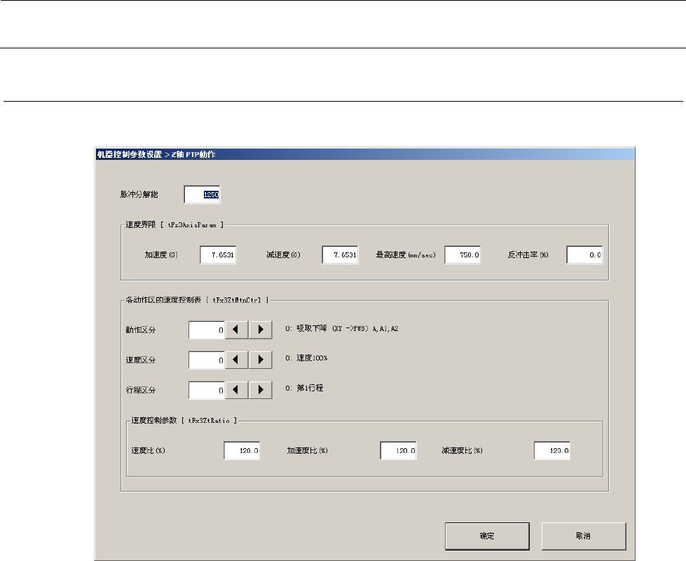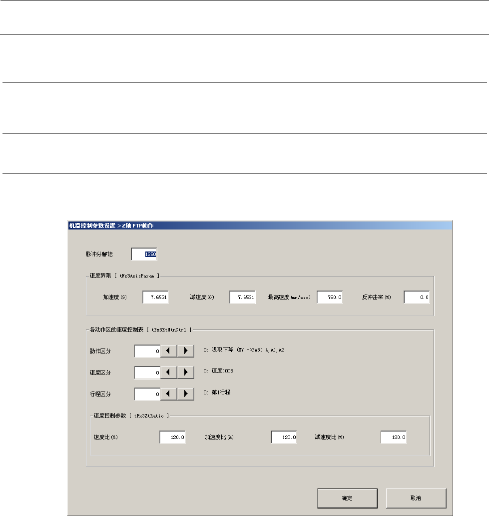 Rev 4 .0 机器控制参数 2-1-1-1 设定项目 No. 项目 输入范围 单位 备考 最小值 最大值 1 脉冲分解能 2 速度界限 加速度 (G) - 10 10 G 3 减速度 (G) - 10 10 G 4 最高速度 (mm/sec) - 1000000 1000000 mm/s 5 反冲击率 (%) - 1000000 1000000 % 6 各动作区的速 度控制表 动作区分 0 24 参照 2-1-1- 2 动作区分 7…