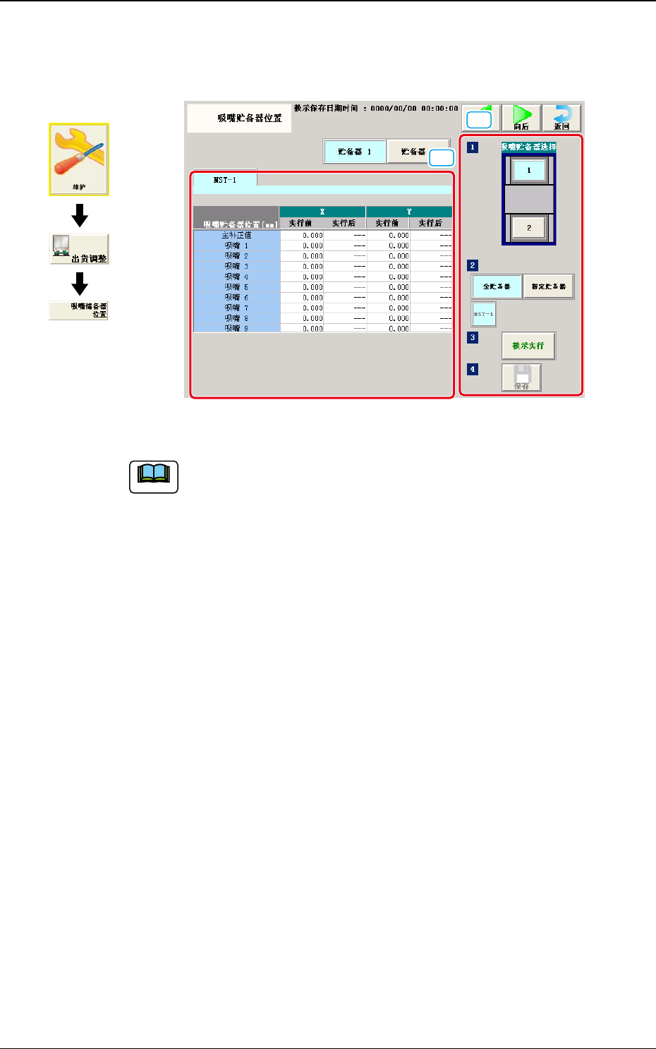 3OM-1732 1-5-33 5.14 吸嘴贮备器 ( 储料器 ) 位置 对保持吸嘴储料器位置 ( 装置坐标基准 ) 的补正值进行教示。 [1] [2] Fig.3A5-23 Note 界面显示根据增设的吸嘴储料器 ( 选项 ) 数而有所不同。 [1] 教示数据显示部 显示指定储料器的教示数据。 [2] 教示步骤显示部 配置有教示中使用的按钮。 贮备器选择 用图像显示表示对应各安装头吸嘴储料器的按钮。 请选择进行教示的储料…