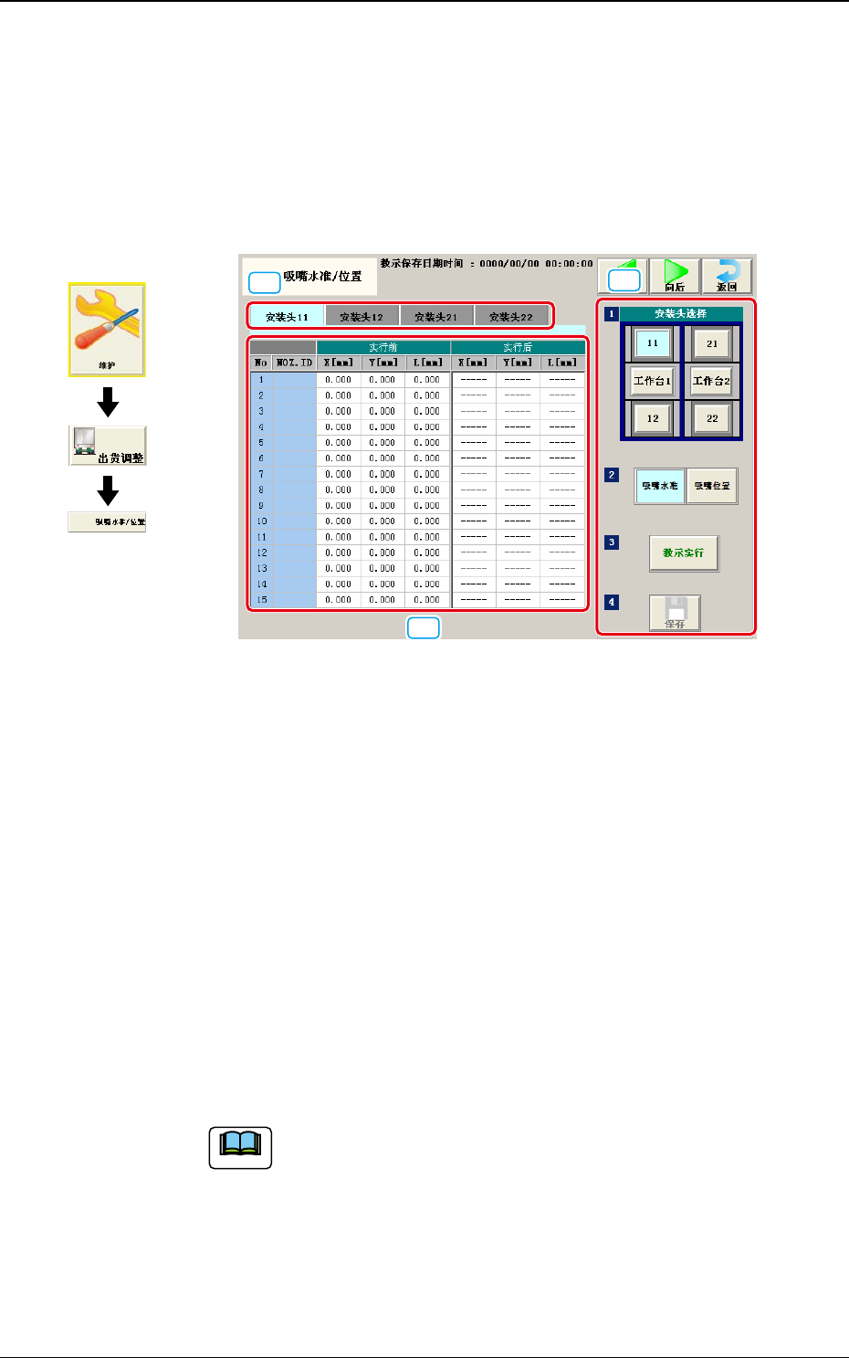 3OM-1732 1-5-37 5.16 吸嘴水准 / 位置 吸嘴水准 对贴装在安装头的通常吸嘴的吸嘴下面水准的补正值进行教示。 吸嘴位置 对安装头旋转中心和吸嘴顶端位置的基准值的偏差进行教示。 [2] [1] [3] Fig.3A5-25 [1] 安装头切换 Tab 切换各教示对应的安装头显示界面。 [2] 教示数据显示部 显示指定安装头吸嘴的教示数据。 [3] 教示步骤显示部 配置有教示中使用的按钮。 安装头选择 用图像显示表示各吸…