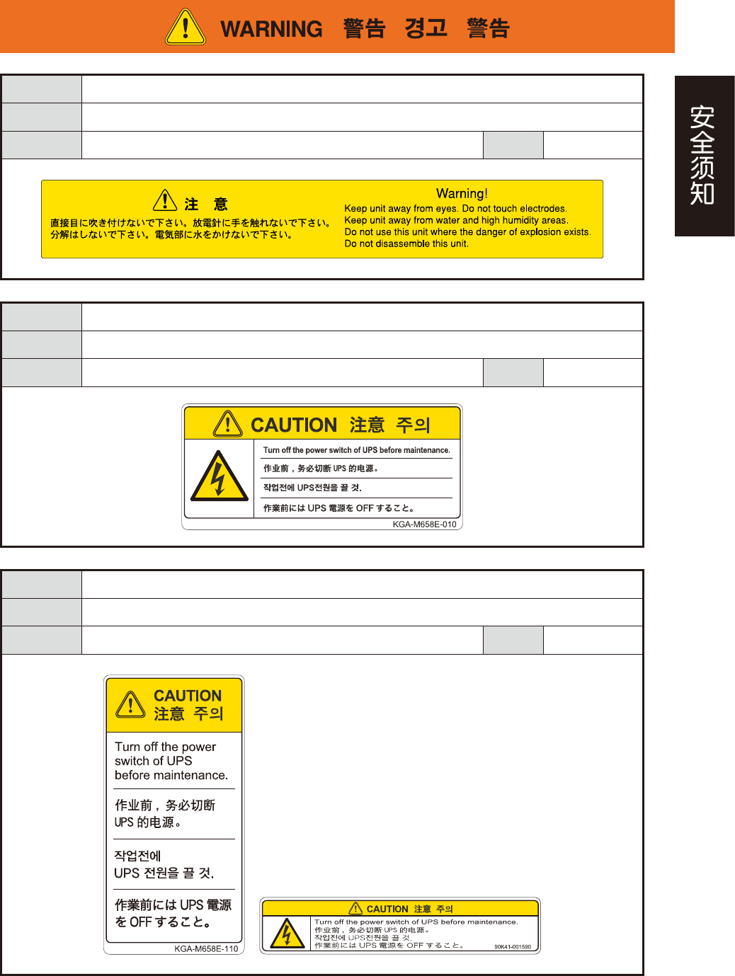 xix 危险结果 有触电的危险。 安全防范 请勿直吹眼睛。请勿拆卸、触碰电极。 对象 配备静电消除器 ( 选配 ) 的设备 警告阶段 所有作业 危险结果 有触电的危险。 安全防范 作业之前,务必关闭 UPS 不间断电源装置的开关。 对象 配备 UPS ( 选配 ) 的设备 警告阶段 维修保养 危险结果 有触电的危险。 安全防范 作业之前,务必关闭 UPS 不间断电源装置的开关。 对象 配备 UPS ( 选配 ) 的设备 警告阶段 维修保…