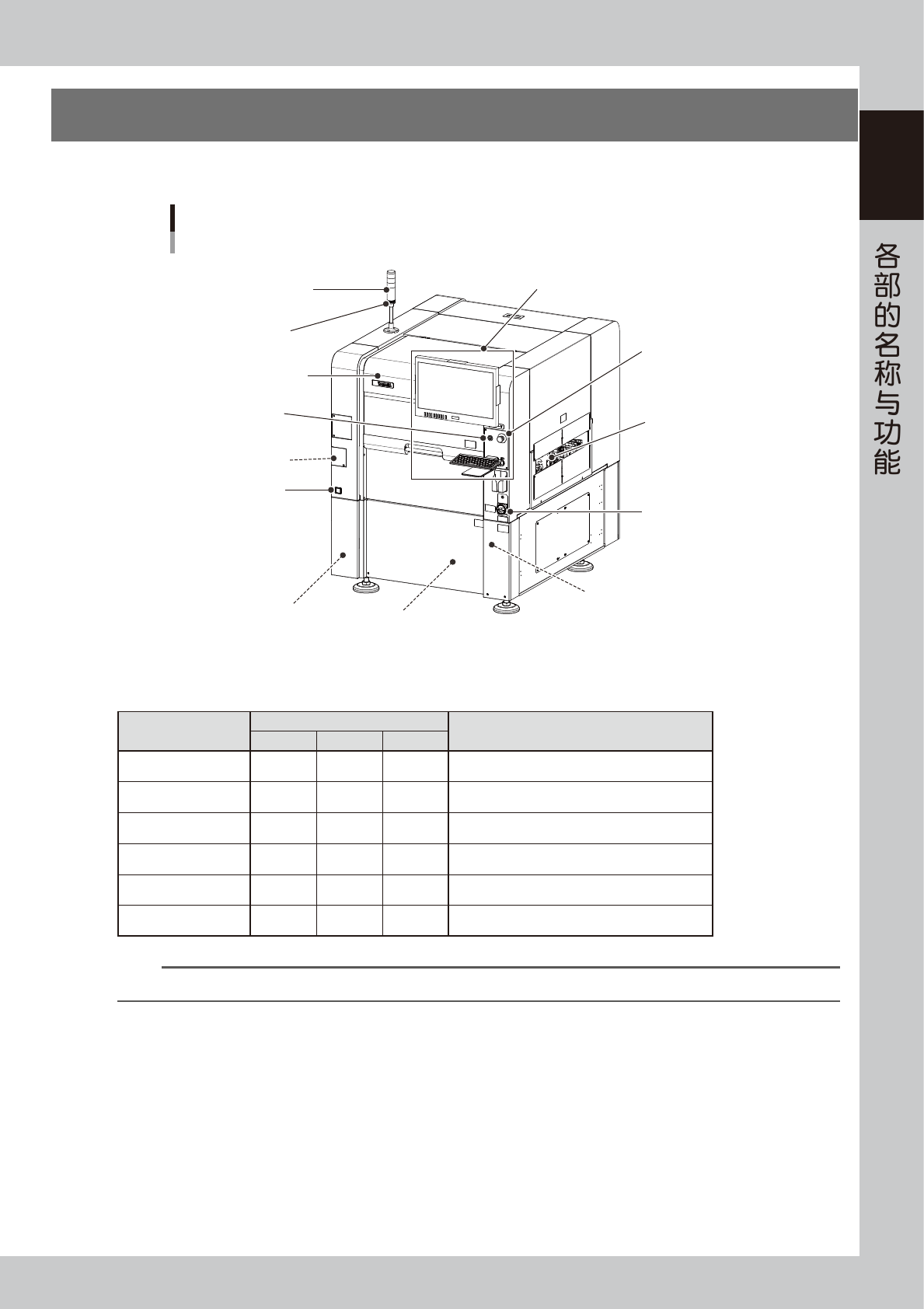 第 1 章 各部的名称与功能 目录 1. YSi-V检查机 1-1 2. 传送装置 1-4 3. 轴的组成 1-5 4. 选配装置 1-7 4.1 标记器 1-7 4.2 激光高度感应器 1-8 4.3 3D 投影仪 1-9 4.4 4D 斜视相机 1-10 4.5 高速双轨 1-11