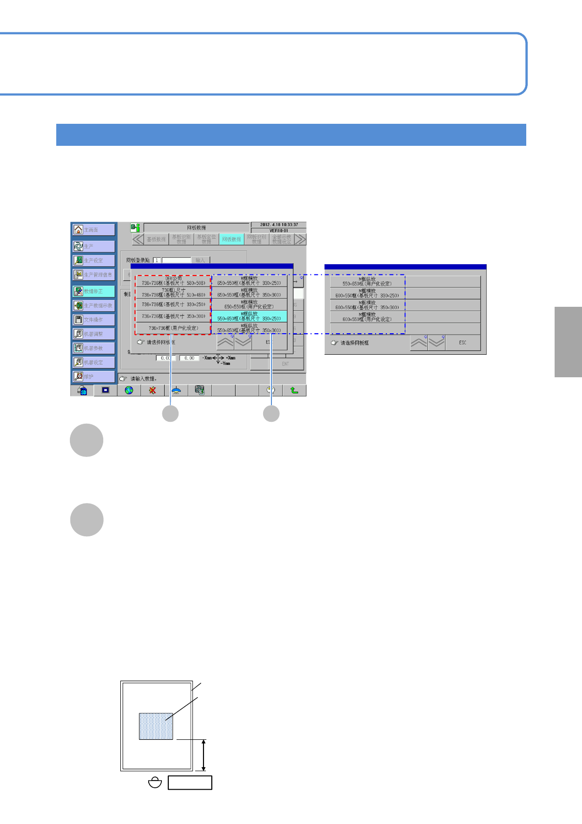 SPG EJP6AC-MB-0 4OM-01 4-1-5 -2 数 据 编 辑 ■ 网板登录 No. 为了识别网板数据 , 输入登录 No 、登录名称。 编辑要点 网板框种类 A B 选购件框种类 ・ M 框横放 650 × 550 m m 框 ( 基板尺寸 330 × 250 m m) ・ M 框横放 650 × 550 m m 框 ( 基板尺寸 350 × 300 m m) ・ M 框横放 650 × 550 m m 框 ( 用户化…