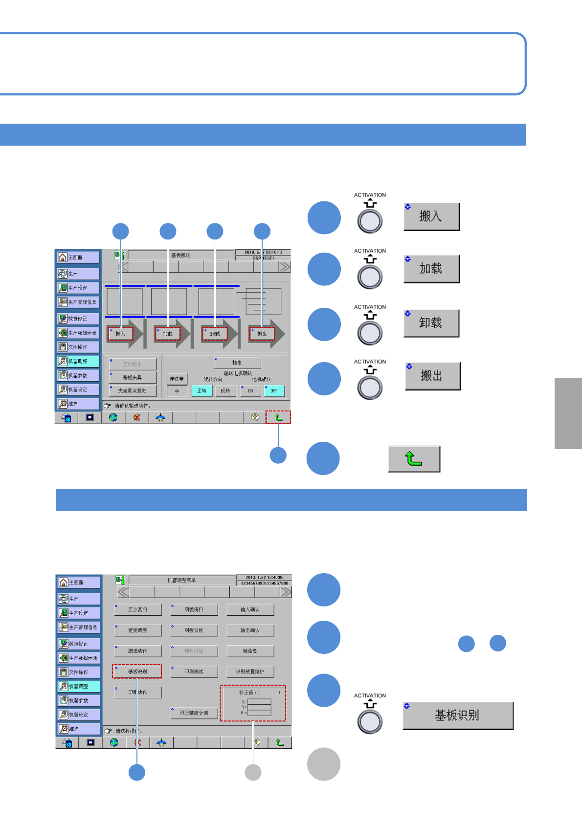 SPG EJP6AJ -MB-05OM- 02 机器 调整 传送动作/基板识别 确认装载基板的传送带 , 向任意位置传送基板。 传送动作 5-1-3 -1 操作篇 5-1-3 各传送带的表示 基板位置 ●等待传入:绿色闪烁 ●载有基板:绿色亮灯 + 1 ■ 决定基板的位置时 ■ 解除基板夹具时 ■ 调整传送带的流动时 + + ■ 支架复位到原点时 + ● 切换旋转方向时 ● 传送带流动时 ● 停止传送带 / + + ■ 拔出基板 + 通…