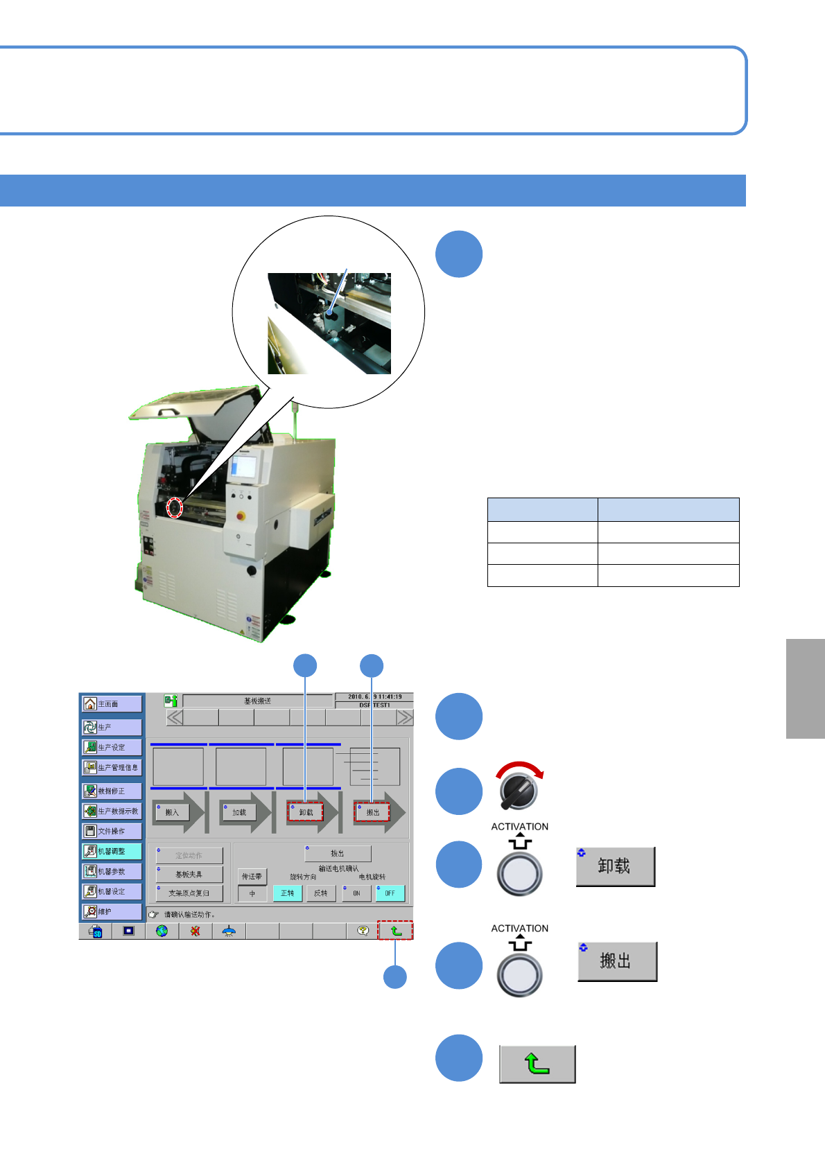 SPG EJP6AJ -MB-06OM- 02 选购件 基板上按压动作的设定/ 基板传送测试 2 基板传送测试(基板夹具力的调整) 传送带宽度、基板支撑销的安装结束后 , 进行基板传 送测试。 ●在「数据修改」画面 (P.4-1-1 -1 ) 上 , 选择各生产 基板的基板传送速度 。 1 伺服电源 ON + 2 6-1-7 -3 操作篇 6-1-7 2 3 4 5 3 + ( 从前工程 , 通过传送带来传送基板 ) 打开安全盖 伺服电…