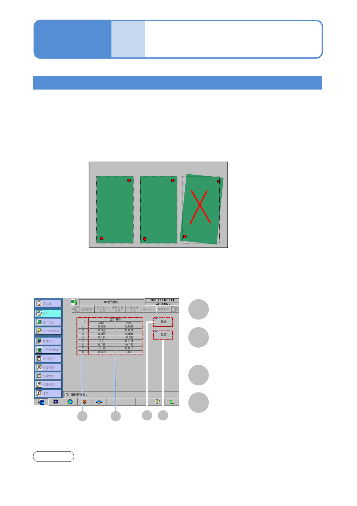 ●相应贴附在载体上的全部单片基板的印刷位置,为了通过印刷位置补正调整到“模式位置偏移容许值”的范