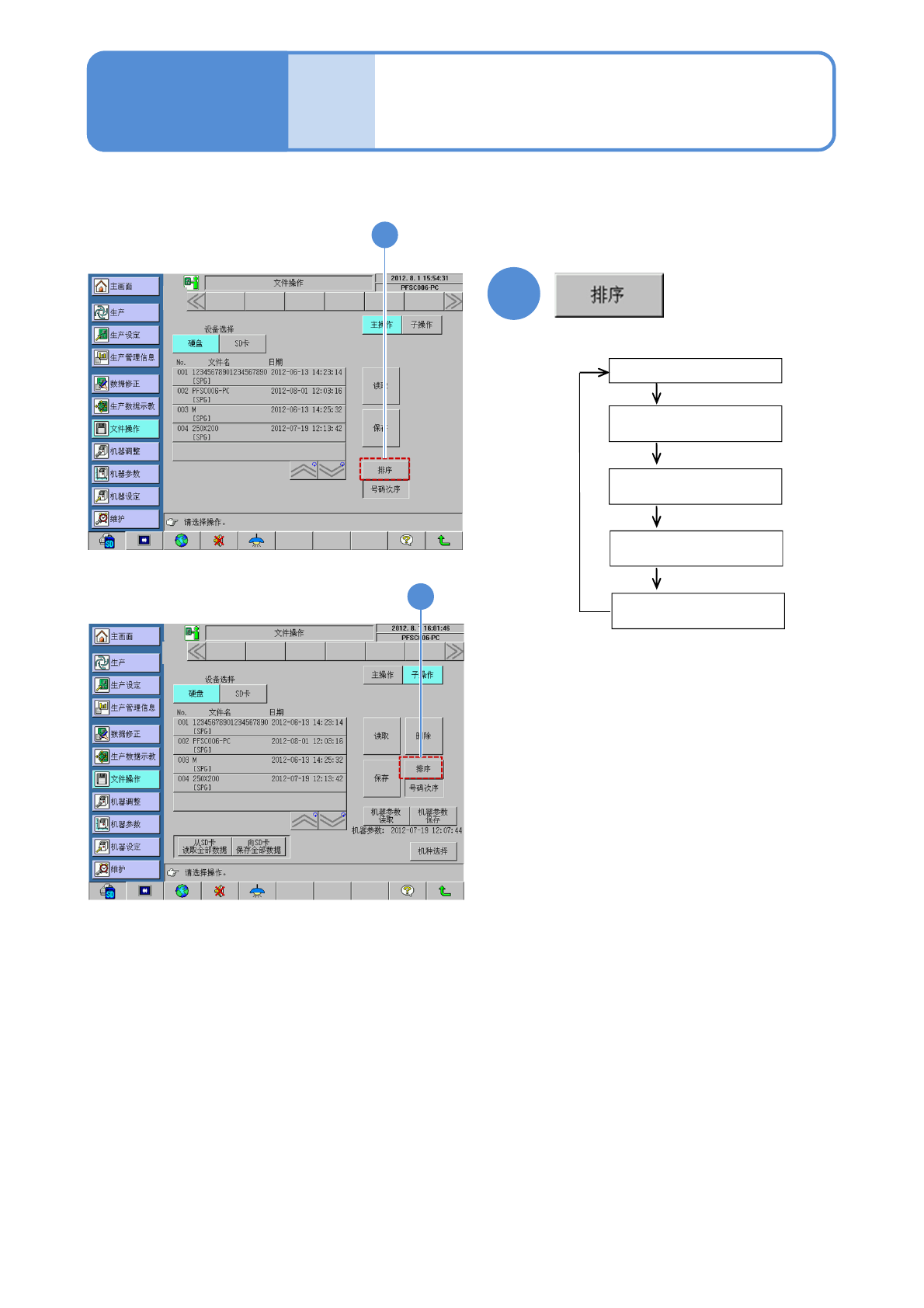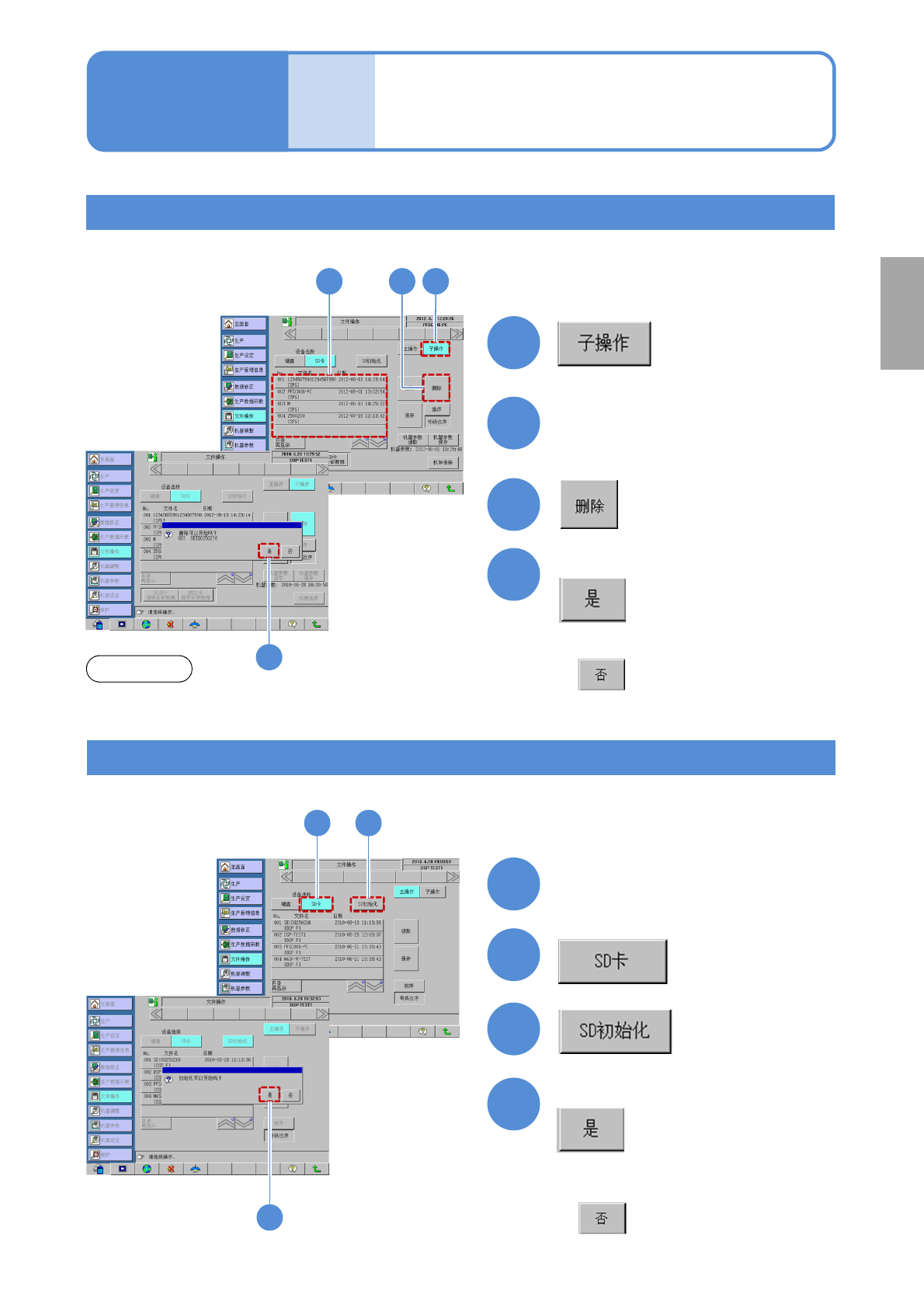 SPG EJP6AC-MB-0 2OM-01 文件 操作 删除生产数据 2 1 选择需要删除的数据 ( 所选择的数据将会反转显示 ) 4 初始化 SD 卡 3 设置执行初始化的 SD 卡 1 2 3 ●等至“硬盘初始化中 ” 的信息消失。 4 2-2-7 操作篇 2-2-7 确认提示信息后 确认提示信息后 1 2 3 2 准 备 3 4 4 ( 返回 ) ●无需删除时 注意 ●机器参数不会被删除。 ( 返回 ) ●无需初始化时 生产数据…