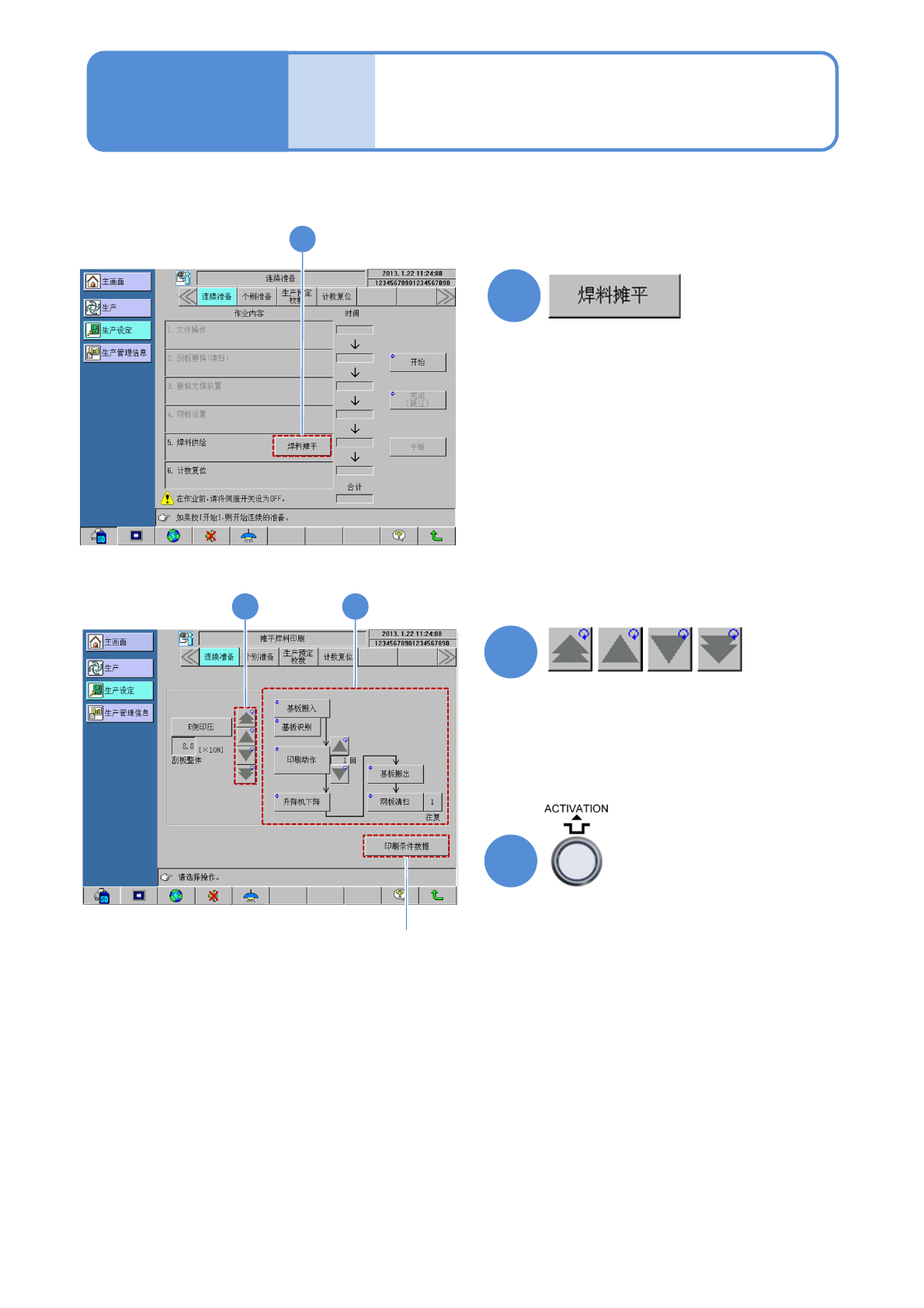 SPG EJP6AC-MB-0 2OM-01 SERVO ON OFF SERVO 确认轴已停止后 连续 准备 焊料的供给 2-3-7 操作篇 2-3-7 1 3 5 4 6 焊料供给 ●确认焊料的剩余量和印刷方 向 , 在网板开口部外侧 50mm 宽处供给约 350g 。 ●按「结束」 , 画面关闭 。 7 或者 8 ●焊料自动供给 ( 选购件 ) 时( → P.6-1-5 ) 9 2 ●不进行焊料调和时 按下在 供给了焊 料的一方 …