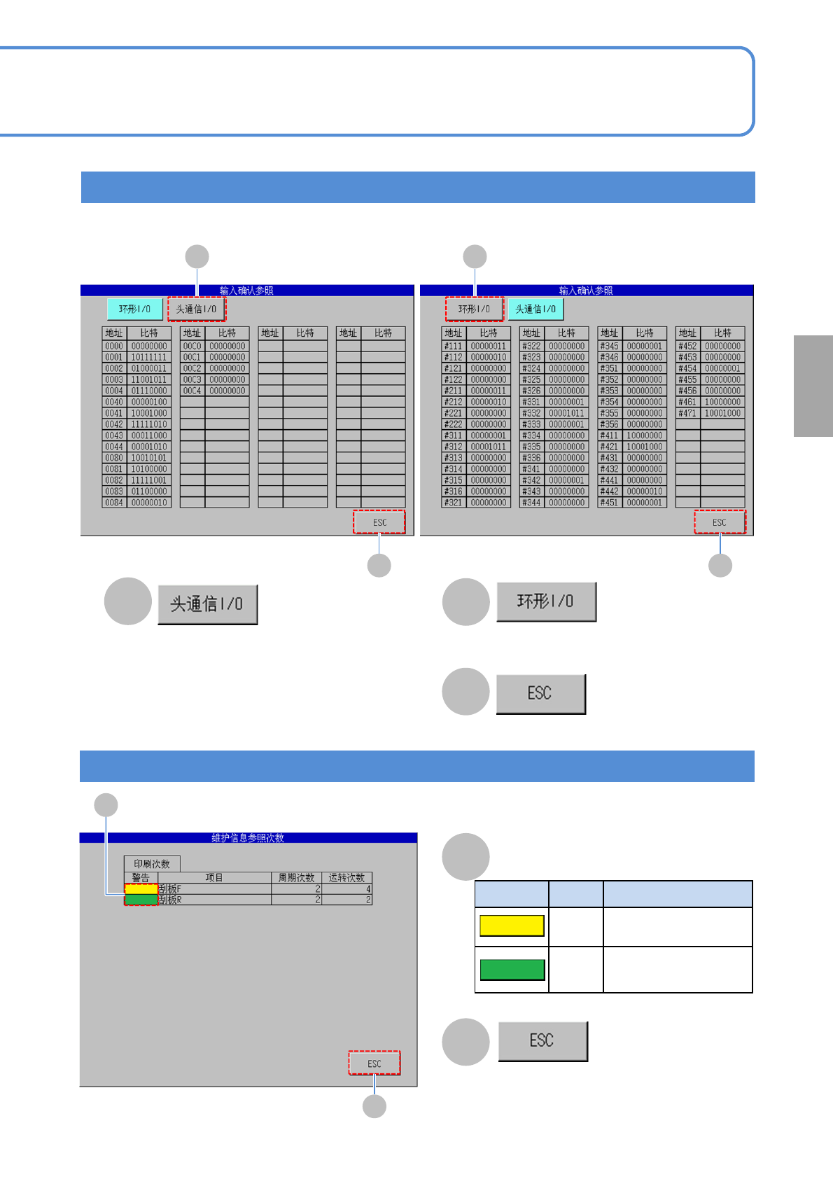 SPG EJP6AC-MB-0 3OM-01 3-1-3 -2 生 产 ■环形 I/O 画面 C ■工作头通信 I/O 画面 A A 输入确认参照画面的确认方法 B C 维护信息参照画面的确认方法 A B C 切换为 [ 输入确认参照 工作头通信 I/O] 画 面。 切换为 [ 输入确认参照 环形 I/O] 画面。 关闭 [ 输入确认参照 ] 画面。 B A B 关闭 [ 维护信息参照 ] 画面。 警告 显示 颜色 显示时机 黄色 超过…