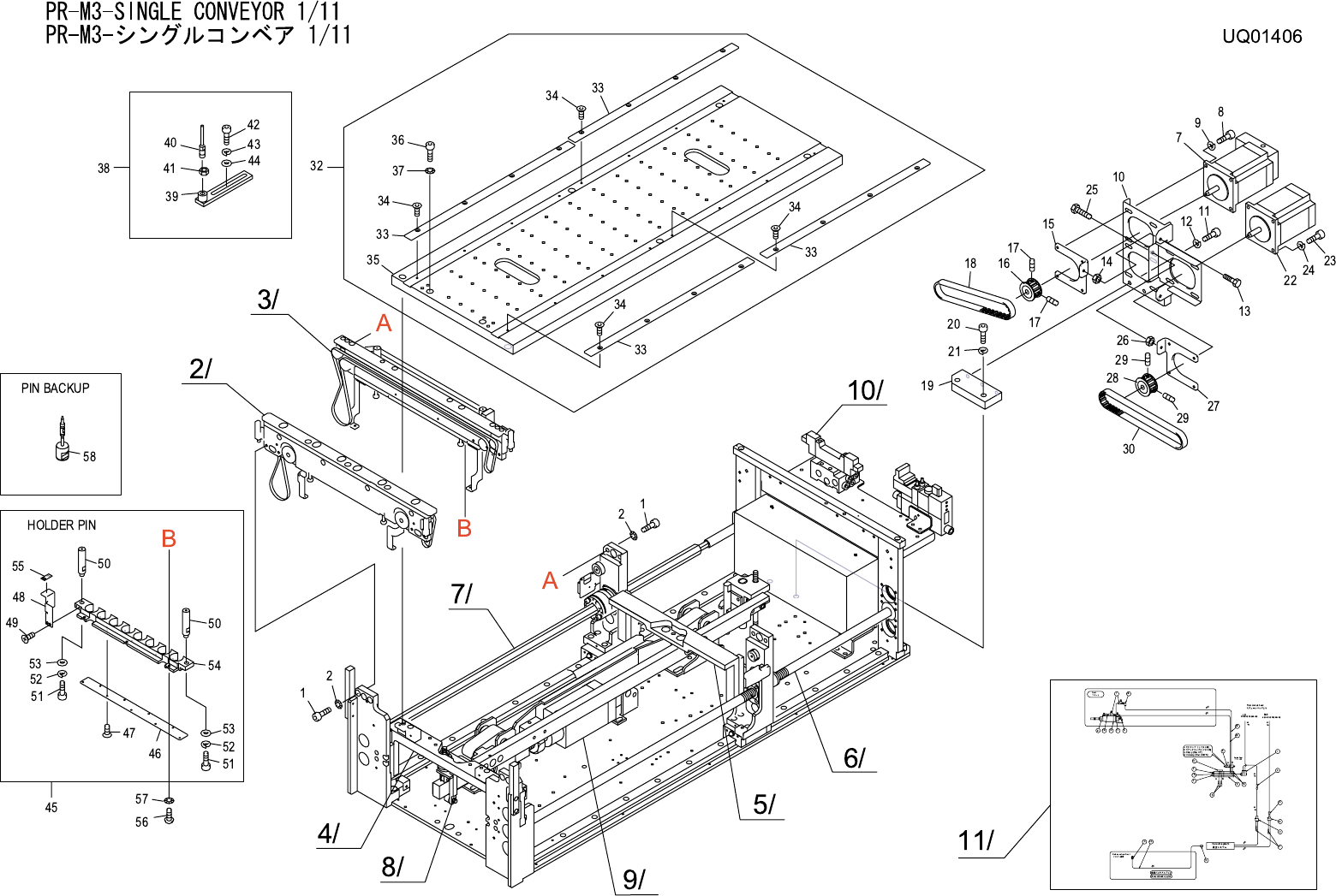 PR-M3-SINGLE CONVEYOR 1/11 PR-M3- シングルコンベア 1/11 UQ01406 No. Drg.No. & Code No. QTY Description Rating Materials Remark 番号 図番 & コード番号 個数 品名 規格 材質 備考 1 H5298A 8 BOLT, HEX SOCKET ボルト 六角穴 M05X010 FE 2 W1012A 8 WASHE…