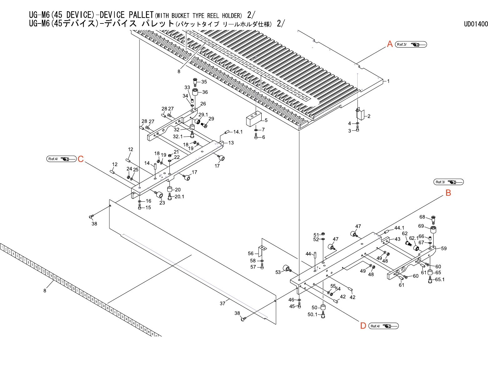 UG-M6(45 DEVICE)-DEVICE PALLET(WITH BUCKET TYPE REEL HOLDER) 1/4 UG-M6(45 デバイス )- デバイス パレット ( バケットタイプ リールホルダ仕様 ) 1/4 UD01400 No. Drg.No. & Code No. QTY Description Rating Materials Remark 番号 図番 & コード番号 個数 品名 規格 …