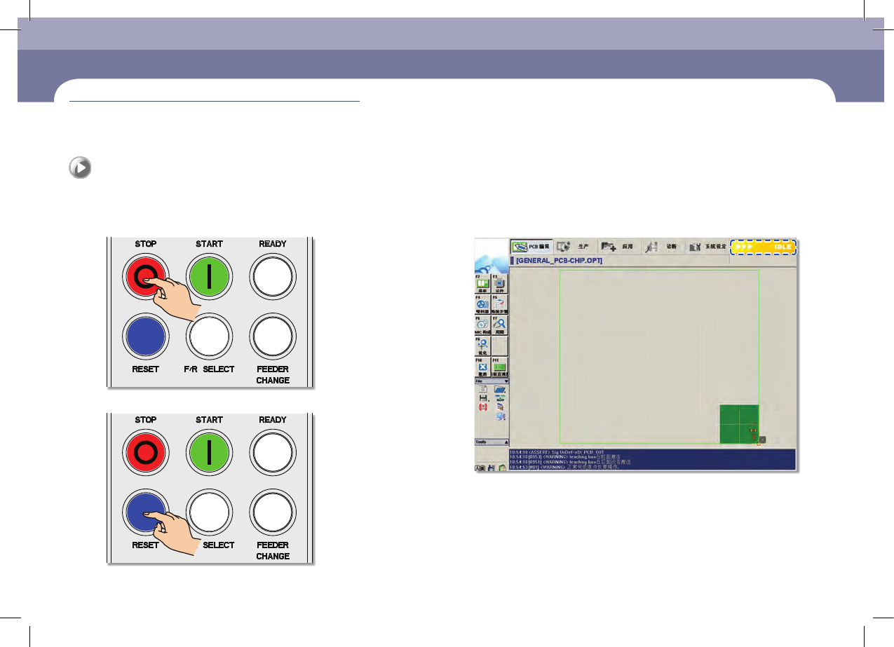 结束生产及更改作业 Chap ter 5 Operation Handbook 5-5 本 Chapter 介绍结束生产的方法、转换到新作业的方法、生产完毕后关闭( OFF )设备电源并且整理设备周边的方法。 Cha n ging Jobs > 转 换成' IDLE方' 状态 Changing Jobs 1. 转换成 'IDL E 方 ' 状态 Step 1. 按 'STOP &a…