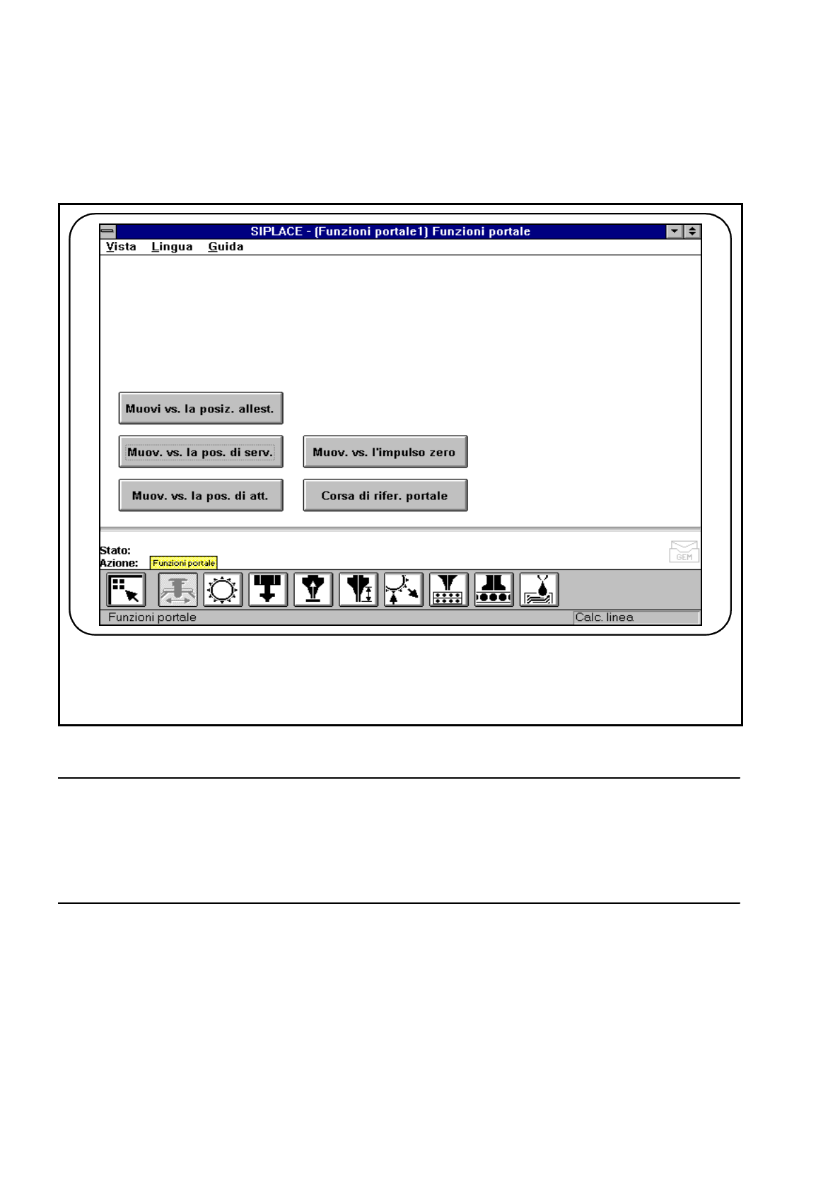 Istruzioni per l’uso SIPLACE 80S -20/F4/F4-6 4 Funzioni singole Edizione 07/97 Versione software dalla SR.403.xx 4.2 Funzioni singole del portale con testa a revolver da 12 4 - 7 4.2.1.2 Muovi verso la posizione di servi…