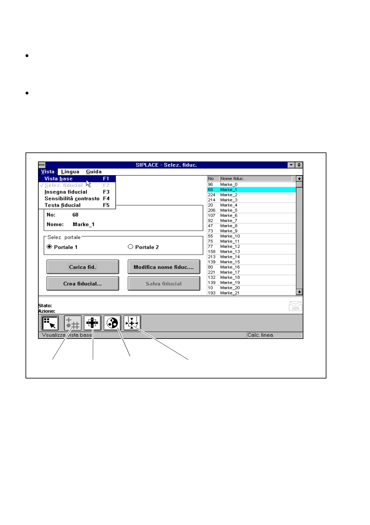 Potrete selezionare i seguenti menu con l´opzione „Insegna fiducial“ oppure con le icone della barra dei sim-