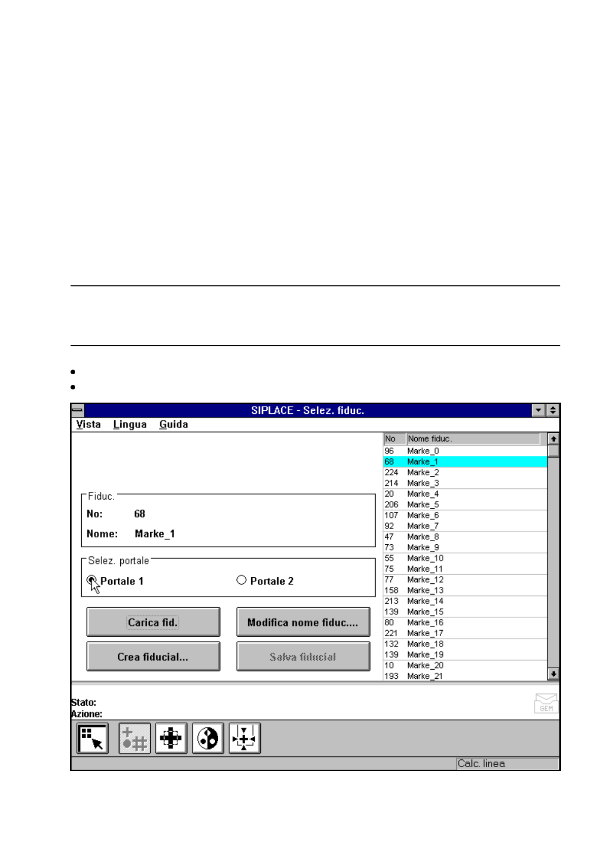 5 Funzioni Vision Istruzioni per l’uso SIPLACE 80S-20/F4/F4-6 5.5 Insegna fiducial Edizione 07/97 Versione software dalla SR.403.xx 5 - 44 Preparato re 5.5.3.2 Opzione „Carica fiducial“ INDICAZIONE Richiama ndo l ´opzio …