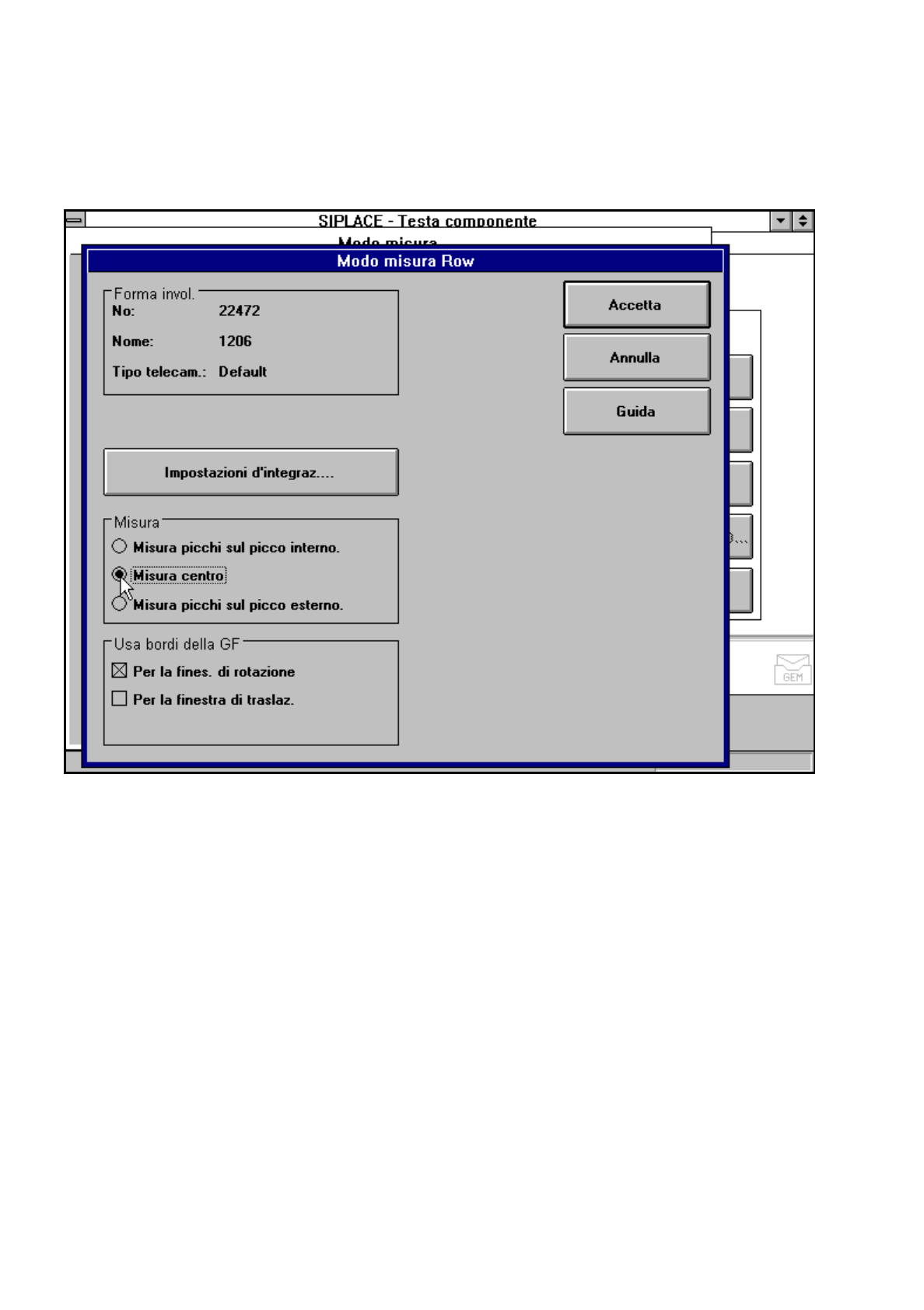 Istruzioni per l’uso SIPLACE 80S -20/F4/F4-6 5 Funzioni Vision Edizione 07/97 Versione software dalla SR.403.xx 5.6 Testa componente Preparato re 5 - 107 Fig. 5.6.27 Opzione „Modo misura“, m enu „Modo misura S ize impost…