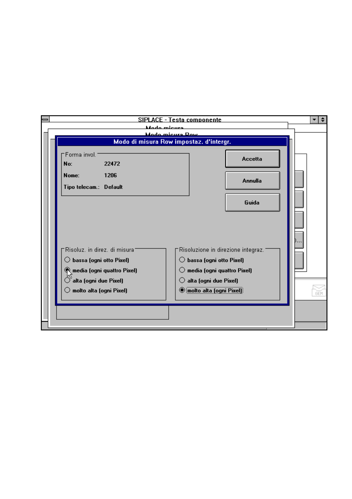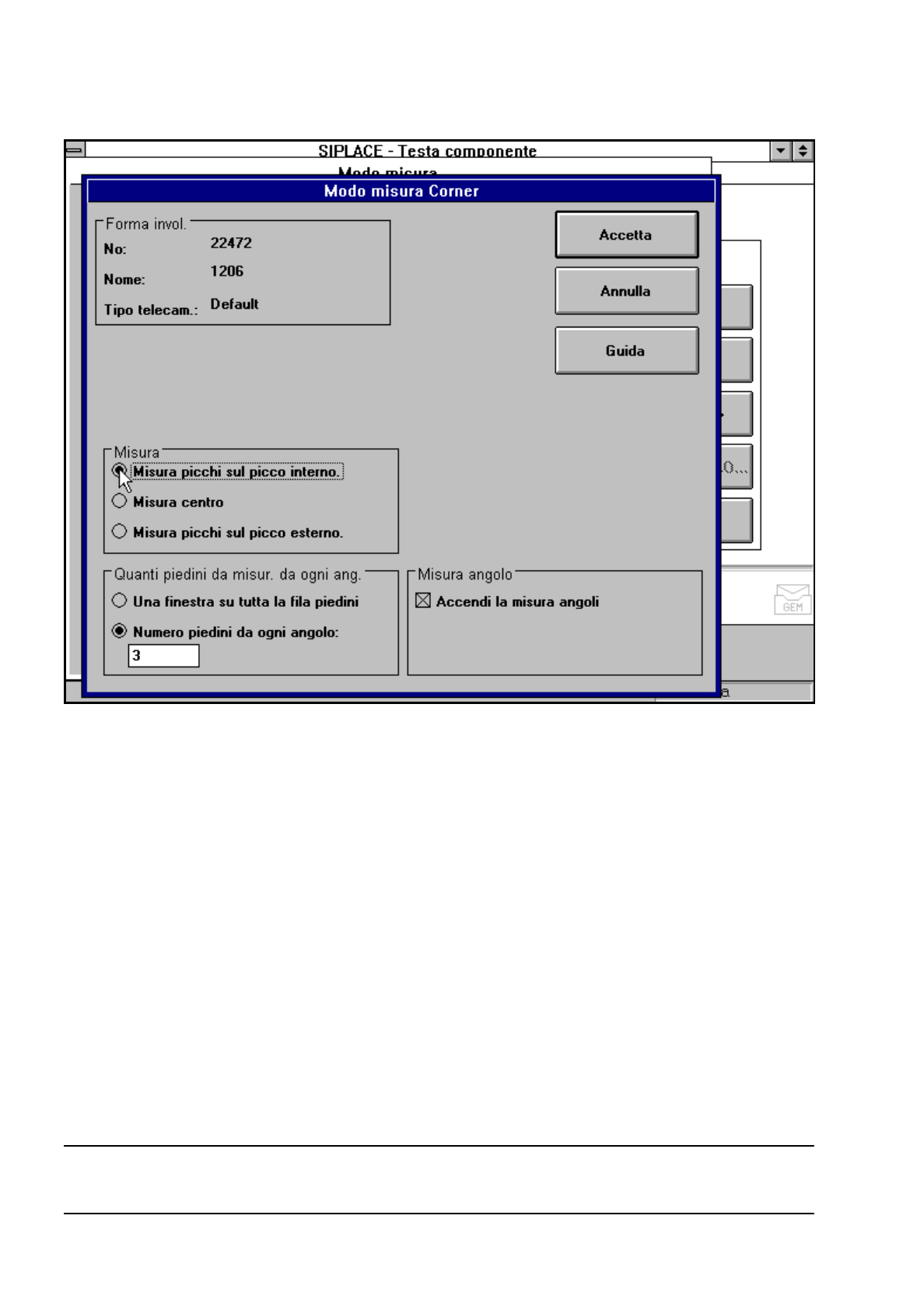 5 Funzioni Vision Istruzioni per l’uso SIPLACE 80S-20/F4/F4-6 5.6 Testa componente Edizione 07/97 Versione software dalla SR.403.xx 5 - 110 Preparato re Fig. 5.6. 30 Opzione „Modo misura“, menu „Modo misura Corner“ Con q…