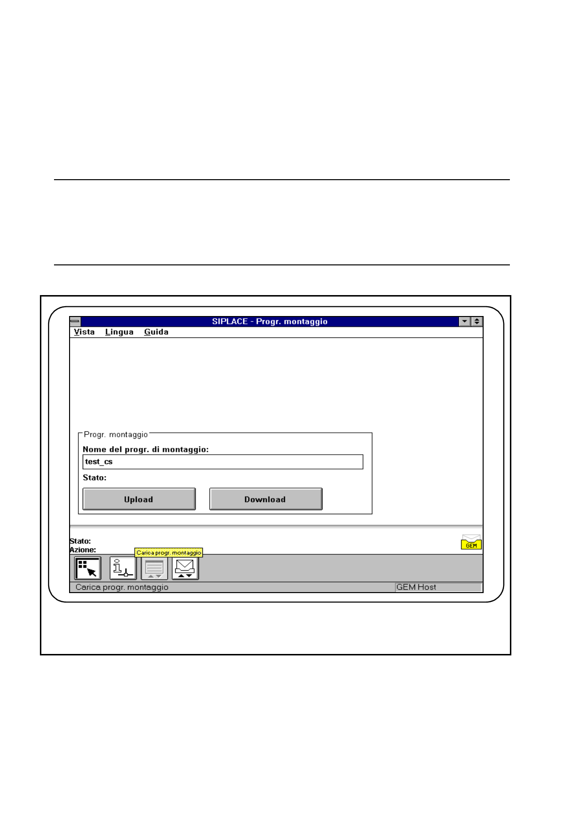 11 Aggiunte alla stazione/opzioni I struzioni per l’uso SIPLACE 80S-20/F4/F4-6 11.9 Interfaccia GEM E dizione 07/97 Versione software dalla SR.403.xx 11 - 70 11.9.2. 7 Carica programm a montaggio ● Nella Vi sta ba se, c …