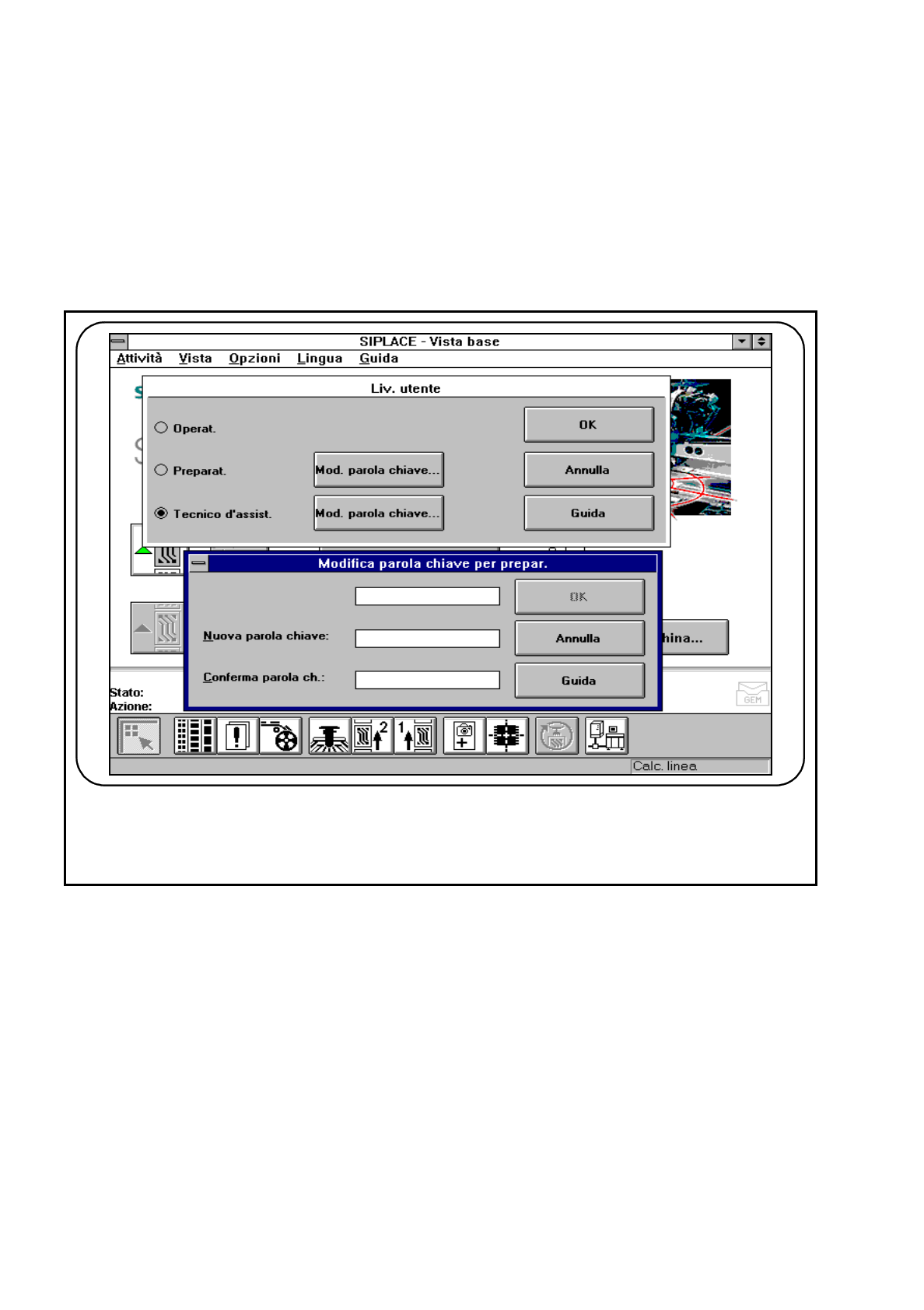 Ai piani d‘utenza del preparatore e del tecnico di servizio potrete assegnare passwords (vedi Fig. 2.4.6). Le