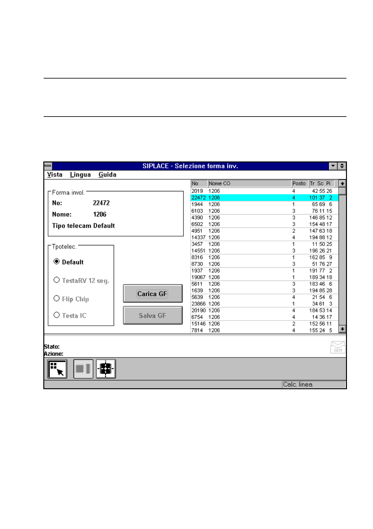 5 Funzioni Vision Istruzioni per l’uso SIPLACE 80S-20/F4/F4-6 5.6 Testa componente Edizione 07/97 Versione software dalla SR.403.xx 5 - 74 Preparato re 5.6.3.2 Opzione „Cari ca GF“ INDICAZIONE Richiama ndo l´ opzione „Ca…