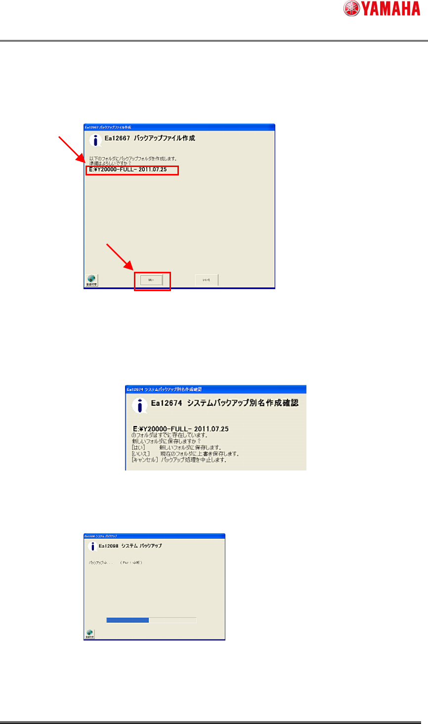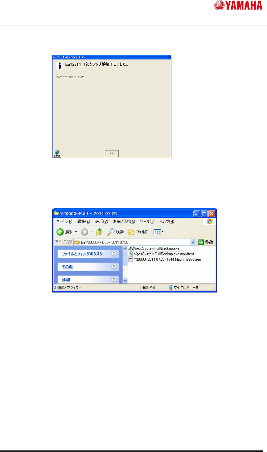 ヤマハ発動機株式会社 IM 事業部 マウンター技術部 ソフト開発グループ MD OC-SOFT50142 システムフルバックア ップ機能説明書 7/1 8 6) 完了メッセージ が出たら完了 です。 完了後、保存先のフ ォルダに、ファイ ルが3つ 作成さ れます。 これらのファイル は、システムフ ルバックアッ プの復元で 利用します 。 ※ 注意 システムフルバックア…