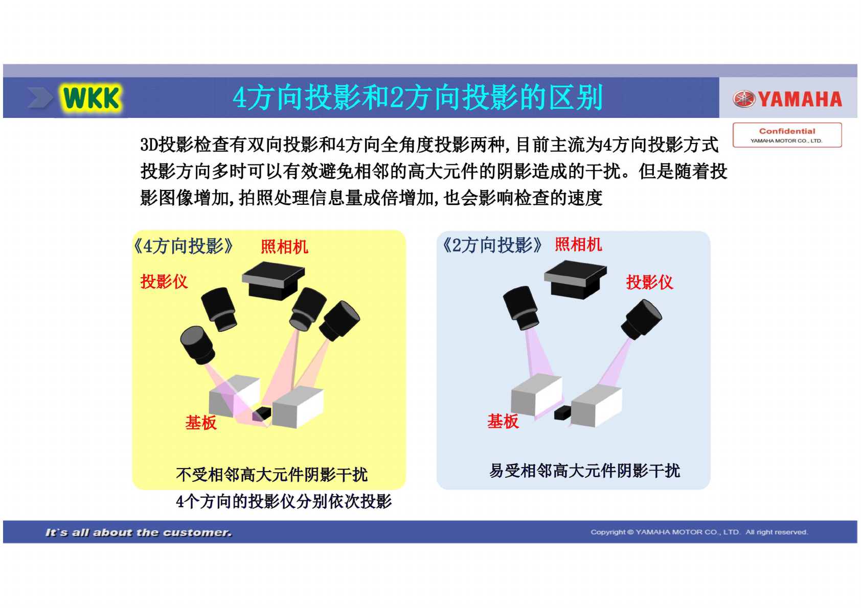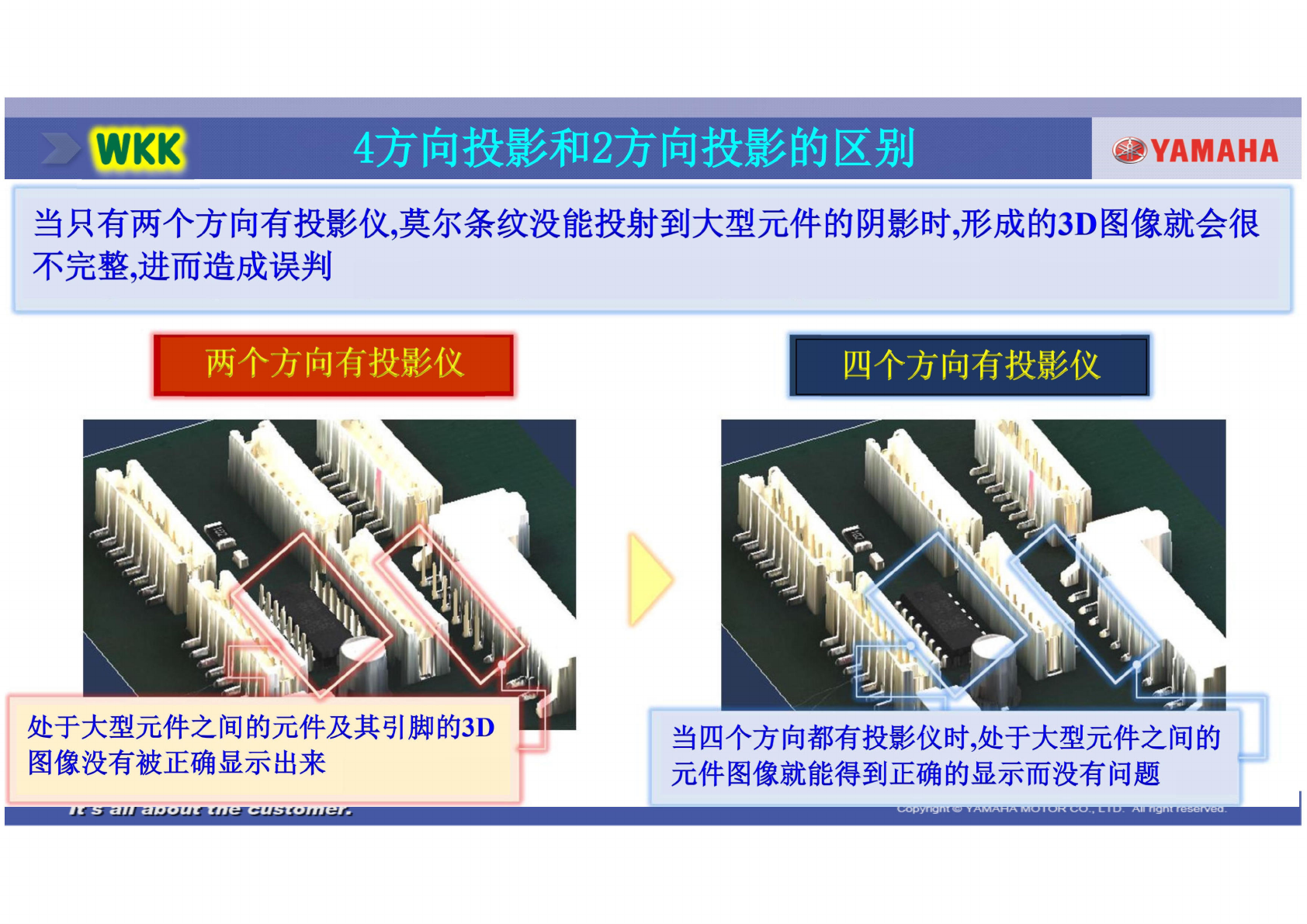, , 3D , , 3D 攀 YAMAHA 4 方向 投影和 2 方 向投影 的区别 当只 有两个 方向有 投影仪 ,莫尔 条纹没 能投射 到大型 元件的 阴影时 ,形 成的 3D 图像 就会很 不完整 ,进 而造 成误判 两个 方向有 投影仪 四个 方向有 投影仪 当四个 方向都 有投影 仪时, 处于大 型元件 之间的 元件图 像就能 得到正 确的显 示而没 有问题