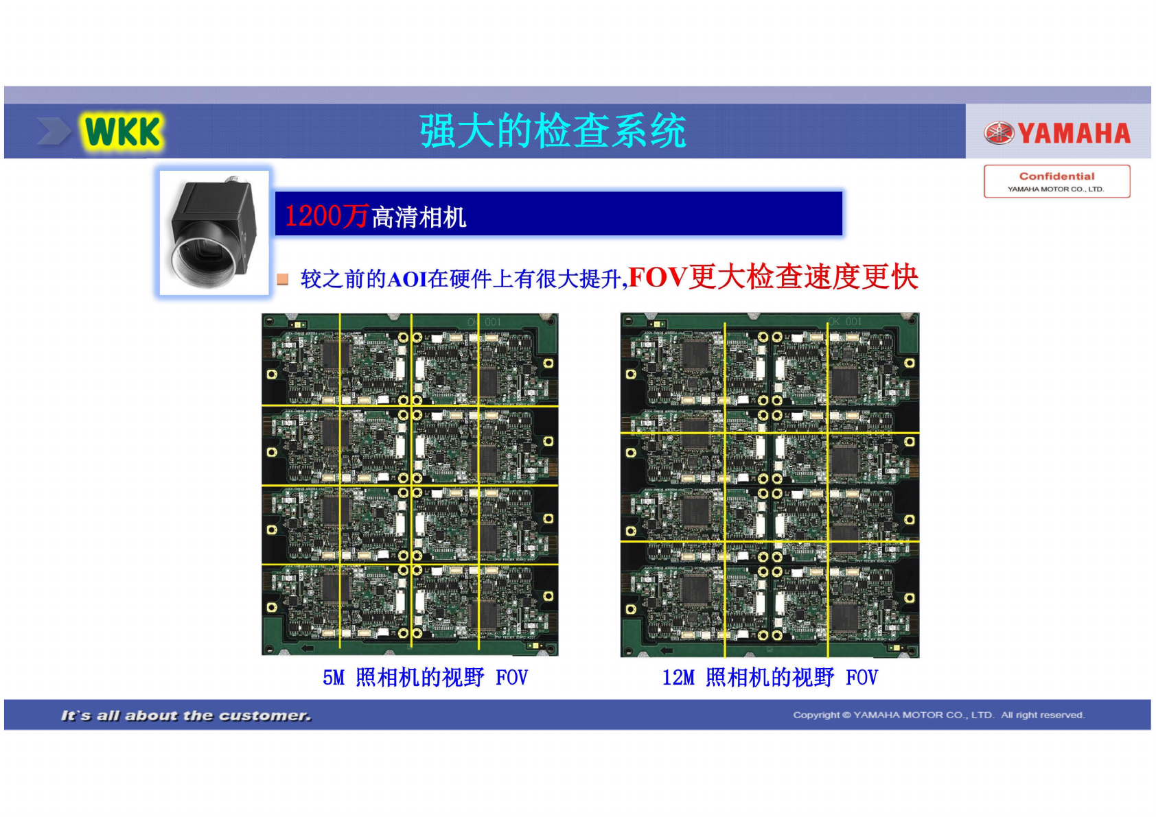 SEPL W14500 -00 V1.00 17 SI1409 004E-000 FOV= 50mmx38mm ( 12 μm ) ◼ AOI , F O V 攀 YAMAHA 强 大的检 查系统 高 清相机 较 之前的 aoi 在 硬件上 有很大 提升, FOV 更大 检查速 度更快 Confidential YAMAHA MOTOR 8“ LTD. 5M 照相机 的视野 FOV 12M 照相机 的视野 FOV It's a…