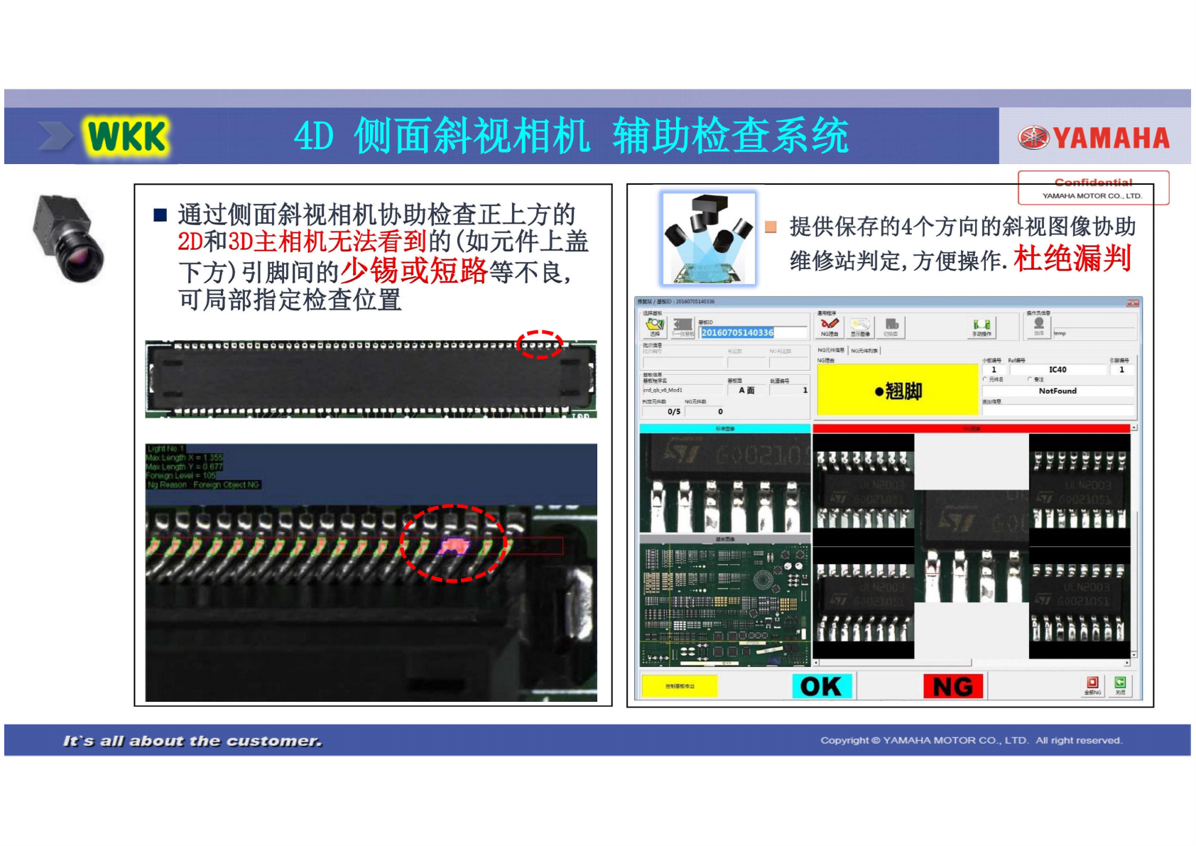 SEPL W14500 -00 V1.00 19 SI1409 004E-000 ◼ ◼ 4D 侧面斜 视相机 辅助检 查系统 通 过侧面 斜视相 机协助 检查正 上方的 2D 和 3D 主相 机无法 看到的 (如元 件上盖 下方) 引脚间 的少 锡或短 路等不 良, 可局部 指定检 查位置 提供 保存的 4 个 方向的 斜视图 像协助 维修站 判定, 方便 操作. 杜 绝漏判 — GQnfidontial YAMAHA MOTOR 8…