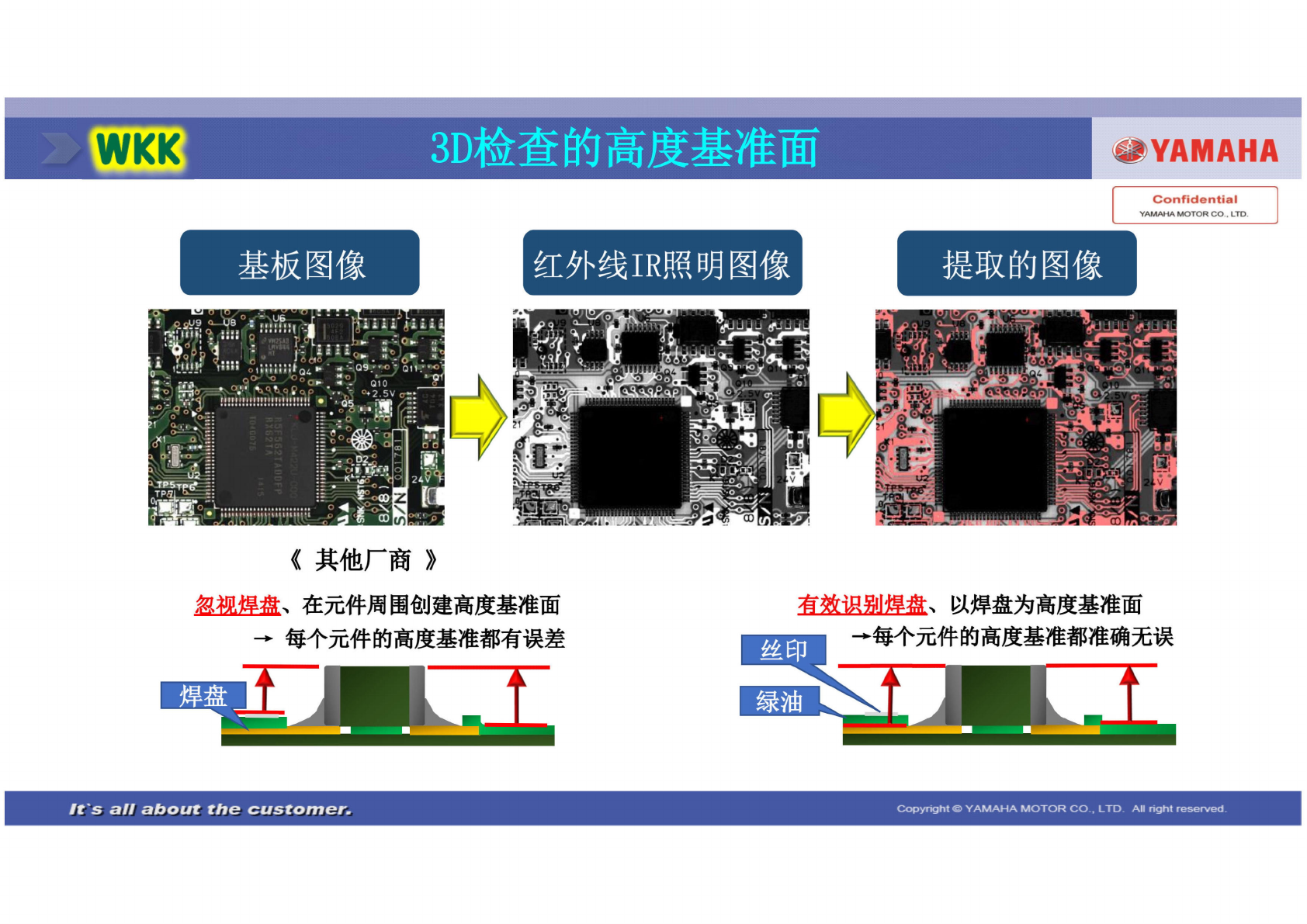 P CB 应用 IR 红 外线照 明 进行高 度测量 攀 YAMAHA 红外 线照射 不仅在 2D 检查中 应用, 而且在 3D 检查中 也被有 效用于 改进高 度测量 的精度 (雅马 哈独有 :穿透 绿油, 丝 印及助 焊剂等 到达元 件周边 PCB 板面或 焊盘, 以此为 各元件 真实精 确检查 基准) PCB 图像 红 外线在 2D 检查 中应用 可 以捕获 与可见 光不同 的图像 减少 丝印和 助焊剂 的影响 把指 定的焊 盘作…