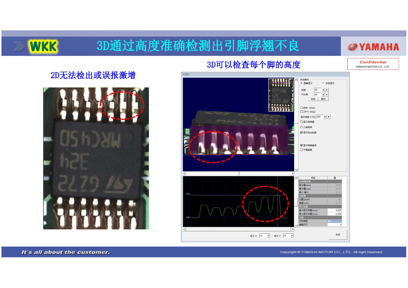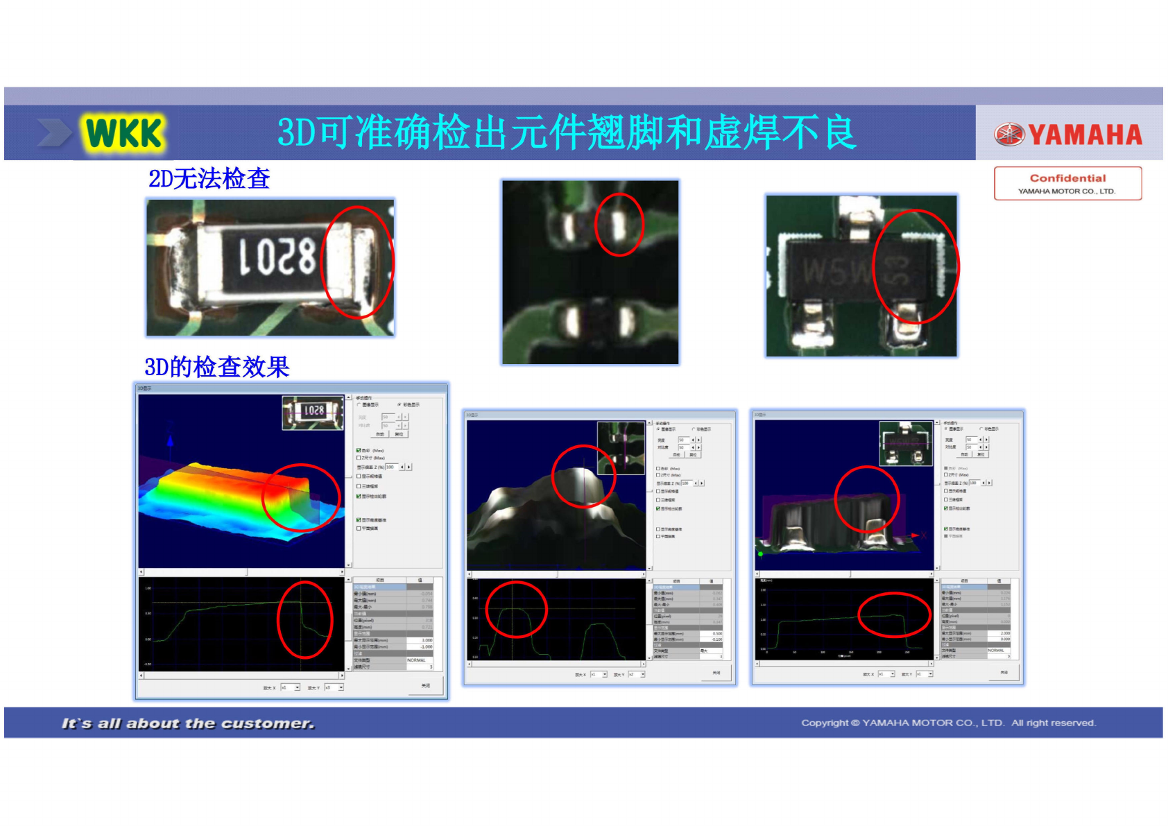 3D 可准 确检 出元件 翘脚和 虚焊不 良 2D 无法 检查 3D 的检 查效果 Confidential YAMAHA MOTOR CO.. LTD. ft's a// about the customer. Copyright © YAMAHA MOTOR CO., LTD. All right reserved.