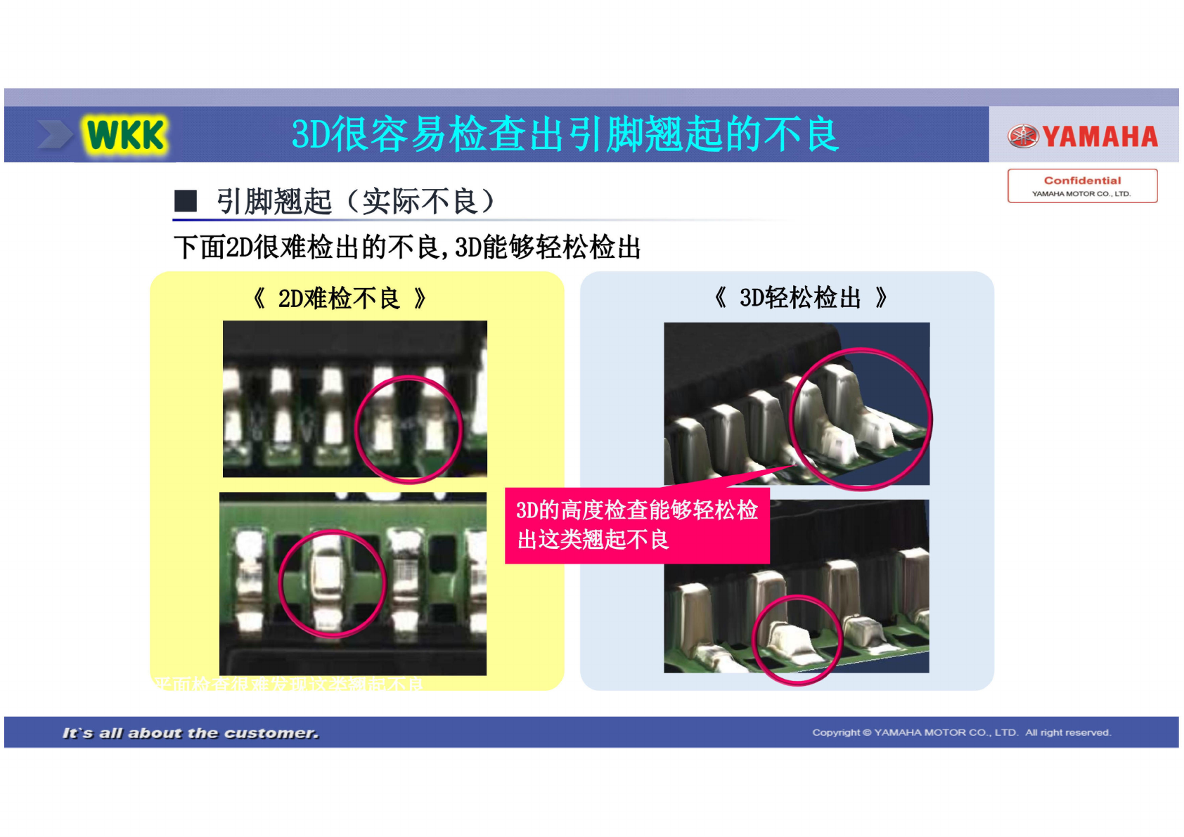 匿 YAMAHA /异物 (过 去发 生过的 不良) 翘脚 和异物 的检查 Confidential YAMAHA MOTOR CO.. LTD. 过去发 生过的 翘起类 不良也 未发生 漏检, 检查 一直保 持稳定 《 2D 检查 图像 》 《 3D 检查 图像 》 ft's all about the customer. Copyright © YAMAHA MOTOR right reserved.