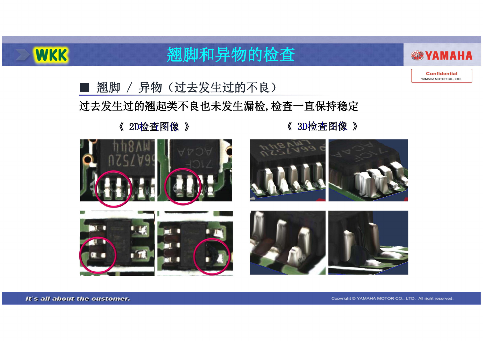 翘件 (实际 不良) 元件 翘起也 能像检 查翘脚 一样轻 松检出 翘件 的检查 Confidential YAMAHA MOTOR CO.. LTD. 《 2D 难以 检查 》 《 3D 轻易 检出 》 通过 高度轻 松检出 0603 元件的 锡膏很 少时, 2D 检查 很难 捕捉翘 起不良 右 图的这 类大型 元件的 翘起不 良 2D 也有较 好的检 出率, 但 是微小 元件 时没有 3D 检查很 难保障 It's all…