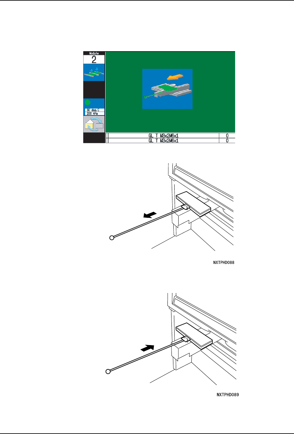 4. 生产 QD060-06 36 GL 工作头使用说明书 4.7 清扫试涂敷板 生产中, 当试涂敷板 上没有能够涂敷的领域时, 显示以下的试涂敷板擦拭向导。 请拉出试涂 敷板,擦取所有被涂敷在试涂敷 板上的胶着剂。 1. 握住 GCU 的滑动杆,拉出试涂敷板。 2. 擦取所有被涂敷在试涂敷板上的胶着剂, 或者更换别的试涂敷板,推入滑动 杆返回到原 处。 NXTPH D0 8 7a