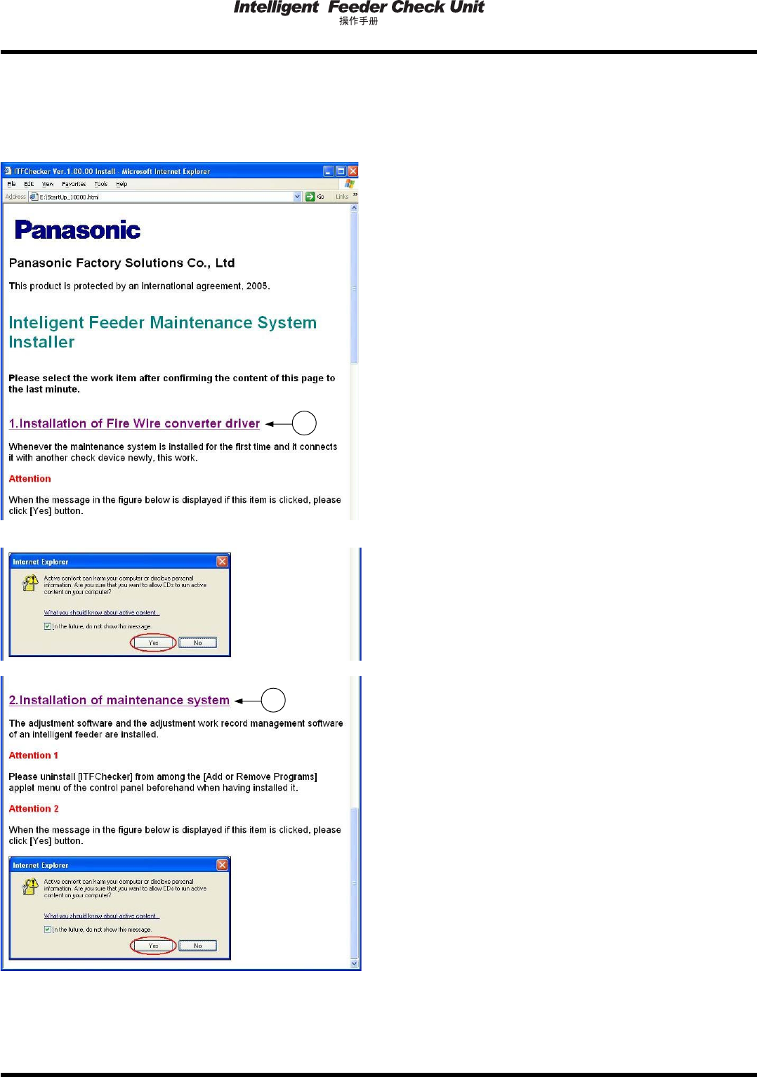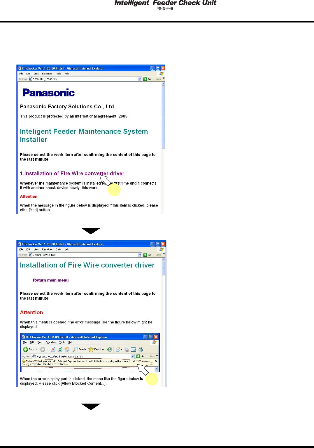 4.2 安装方法 Page 4-4 EJW2A-C-OMA04-A01-02 4.2.1 主菜单 主菜单由 FireWire 转换驱动程序的安装菜单、检 查装置系统软件的安装菜单组成 。 ∗ 进入目标安装菜单之前,请阅读主菜 单的全部内容。 • 进入 FireWire 转换驱动程序的安装菜单时,单 击字符串 。 • FireWire 转换驱动程序的安装是最初安装 检查 装置系统软件时、或另外连接新检查 装置时进 行。 ∗ 显示如左所…