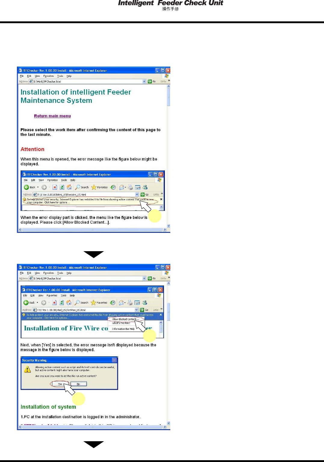 4.2 安装方法 Page 4-14 EJW2A-C-OMA04-A01-02 5. 以 Administrator 管理员的权限登录到安 装地的 PC 。 • 已经以 Admini stra tor 管理员登录时, 不必重新 登录。 6. 单击 “[ITFChecker] folder” ((ITFChecker) 文件夹 ) 。 • 显示如左所示的窗口。 7. 双击窗口内的 “setup.exe” 。 *是 Windows 7 时画…