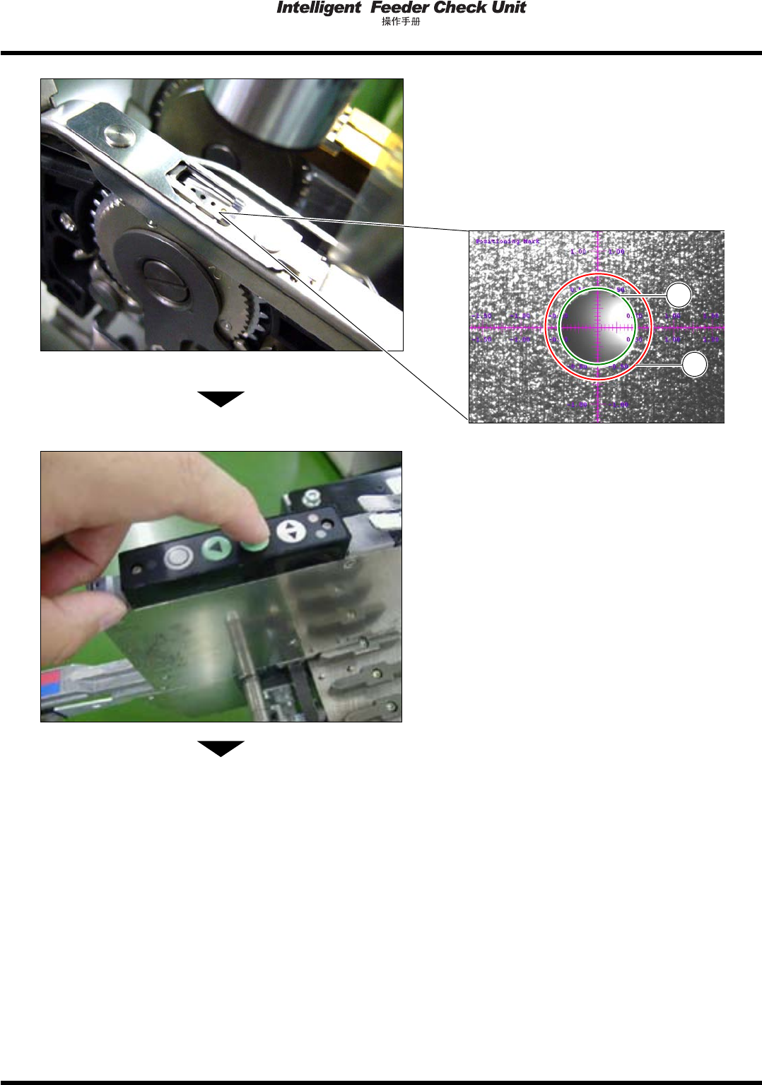 5.1 ITF 调整软件 Pa ge 5- 12 2. 气动式 8 mm 单式 编带供料器原点的 检查及调整 (X 方向 ) 1. 通过主画面的菜单选择 “Display Item” ( 显 示项目 ) 的 “Positio ning Mark” ( 定位标 记 ) 。 • 在监视器上显示定位标 记。 2. 使用主治具调整照相机位置和焦点,并使 其对准 8 mm 双式 (L) 的吸着位置。 3. 移换至已设置治具编带的气动式 8 mm …