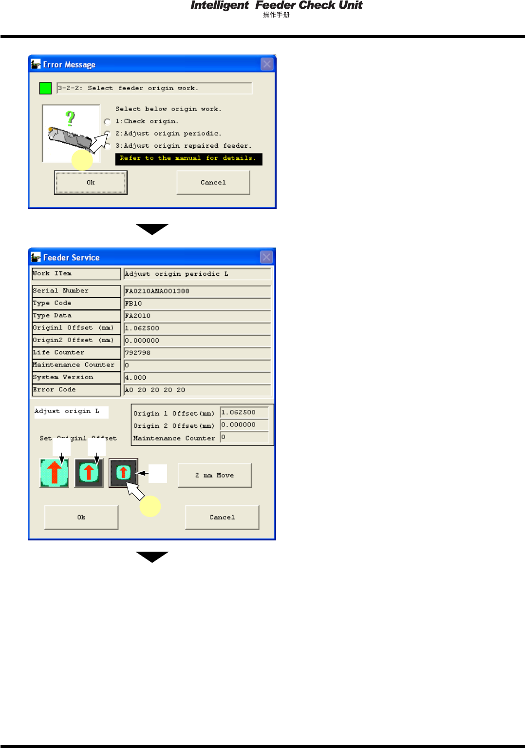 5.1 ITF 调整软件 Pa ge 5- 19 6. 要进行定期维修时,选择 ‘2: Adjust origin periodic.’ (2: 定期原点调整 ) 。 ∗ 随着元件更换进行再次 调整时,请选 择 ‘3: Adjust or igin r epaire d feede r.’ (3: 修理过供料 器的原点调整 ) 。 7. 显示轨道的选择信息后,选择要检查的轨 道 L 或 R 。 • 显示原点调整菜单。 8. 使用各自具有…