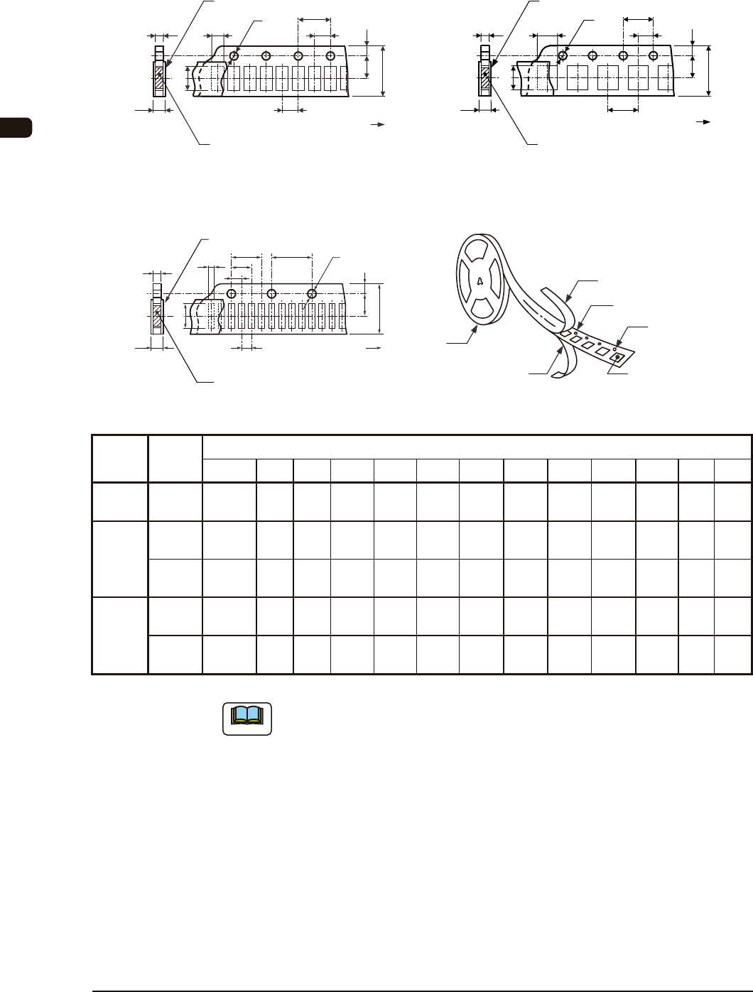 OM-1617 8-2 8. 带式送料器规格 8.1.1 参考编带尺寸 (8mm 纸 ) 方形穿孔装料编带 方形穿孔装料编带 T 2 D 0 A 0 P 2 P 0 P 1 T F E W B 0 封口盖带 φ 已贴装元件时 拉出方向 (链轮齿孔) T 2 A 0 P 2 P 0 P 1 T F E W B 0 封口盖带 已贴装元件时 拉出方向 D 0 φ (链轮齿孔) 方孔间距 (2mm) FH1 方孔间距 (4mm) FH2 方形穿…