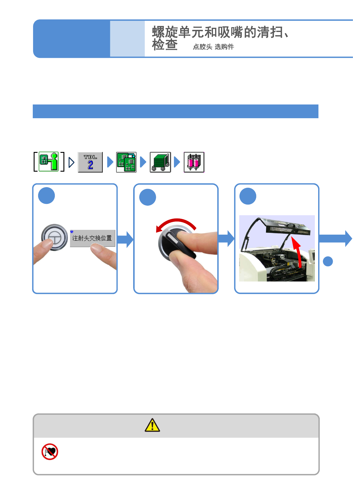 NPM-W2 EJM7DC-MB-04M-00 工作 结束前 OFF SERVO 4-2-5 -1 1 ( ( )) 维修保养篇 4 - 2 - 5 使用工具 : 棉棒,棉纱布,空气枪 所需 时间 :30 分钟 (1 个部位 ) 有关点胶头上设置的点 胶器 清扫和检查的说明。 1 ●点胶头移动到更换位 置 。 2 3 卸下点胶器 警告 使用心脏起搏器等的人员请勿靠近直线马达部 ( 因磁力引起的错误动作,可能造成事故 ) 顺序 4 当点胶…