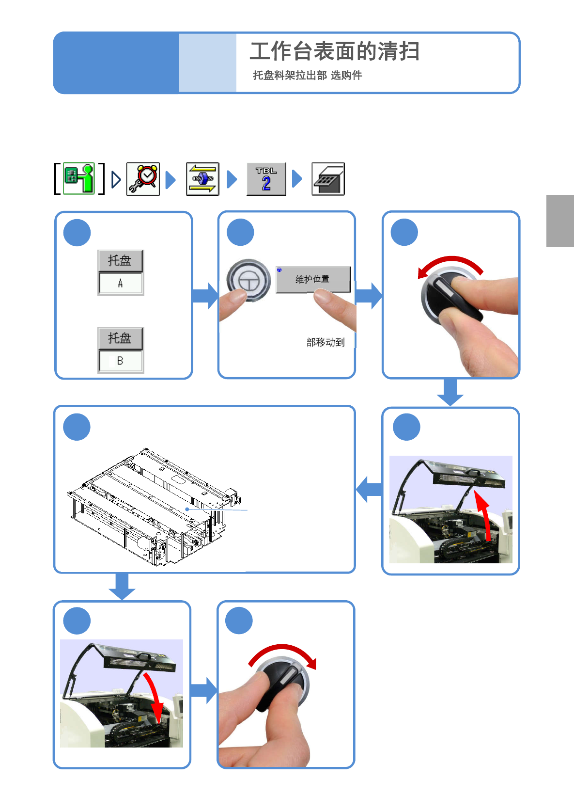 对托盘料架拉出部的工作台表面清扫进行说明。